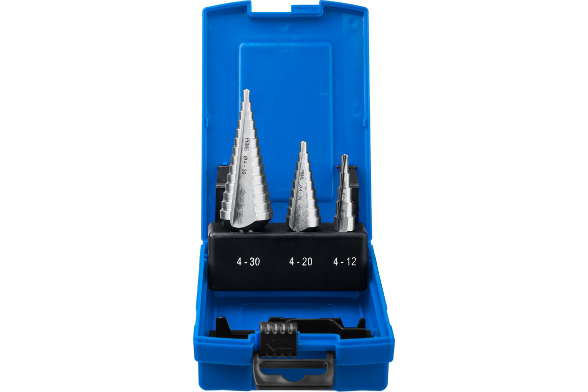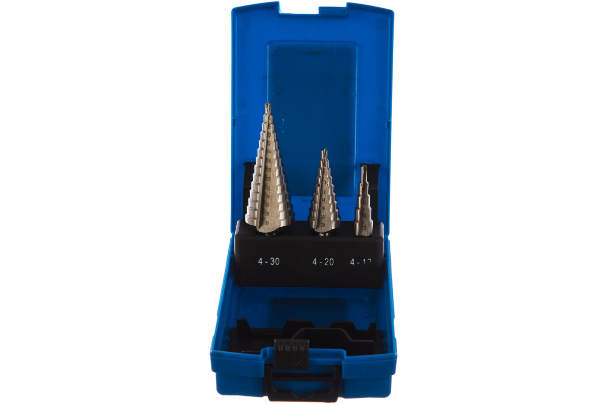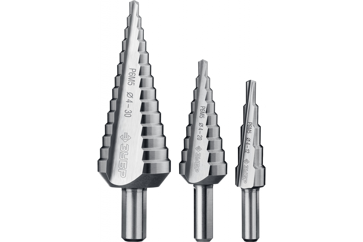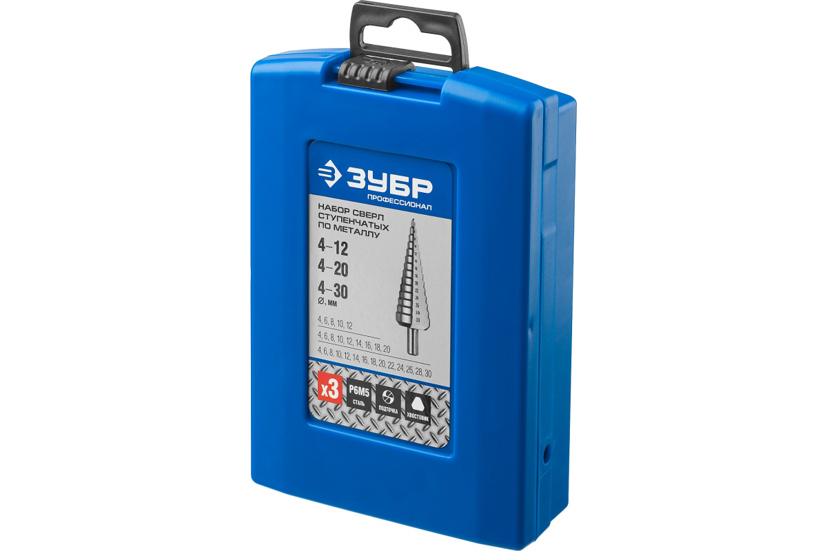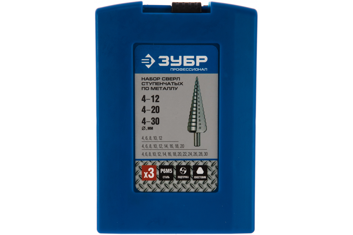 Набор ступенчатых сверл 29670-4-30-H3_z01 Зубр используется на сверлильных станках и электродрелях. Оснастка подходит для работы с такими материалами, как сталь, цветные металлы и пластик. Сверла оптимально подойдут для обработки тонких листов, не деформируя их. С помощью набора достигается высокая производительность при сверлении отверстий большого диаметра. Главная особенность сверла - это его профиль, за счет чего можно выполнять различные по диаметру отверстия, не меняя каждый раз оснастку. Материал сверл быстрорежущая сталь (Р6М5), что является гарантией эффективной работы и надежности инструмента. Сверло с заточкой при вершине 135 градусов и крестообразной подточкой для лучшей работы без заклинивания.