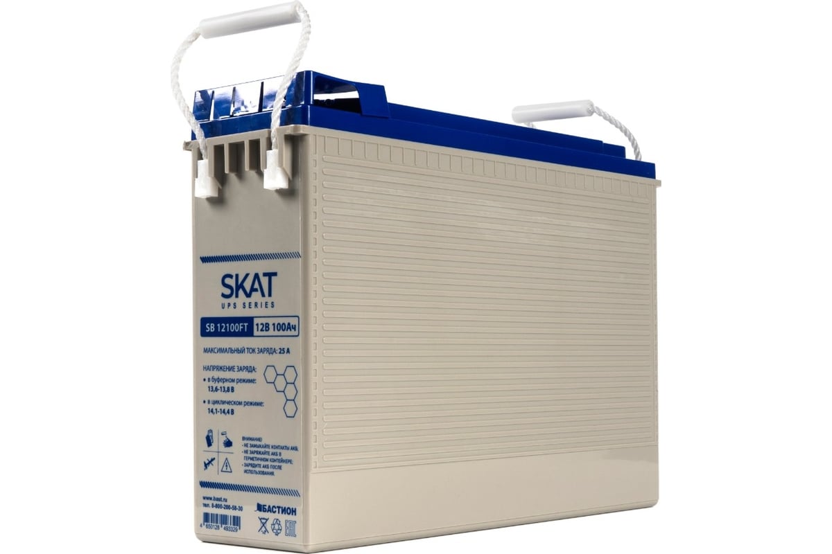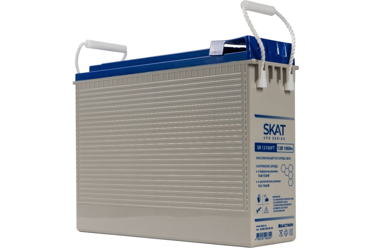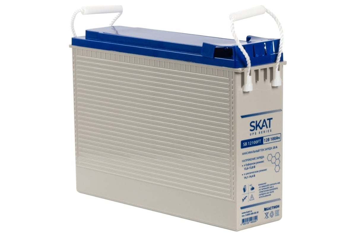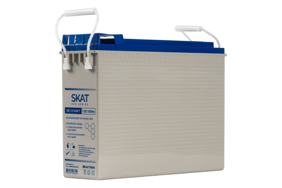 Аккумулятор герметичный свинцово-кислотный необслуживаемый SKAT SB 12100FT, производимый по технологии AGM (Absorbent Glass Mat) с системой рекомбинации газов VLRA, предназначен для использования в составе системы резервного питания.