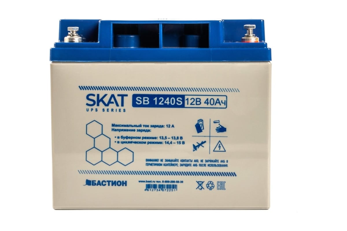 Аккумулятор герметичный свинцово-кислотный необслуживаемый SKAT SB 1240S, производимый по технологии AGM (Absorbent Glass Mat) с системой рекомбинации газов VLRA, предназначен для использования в составе системы резервного питания.