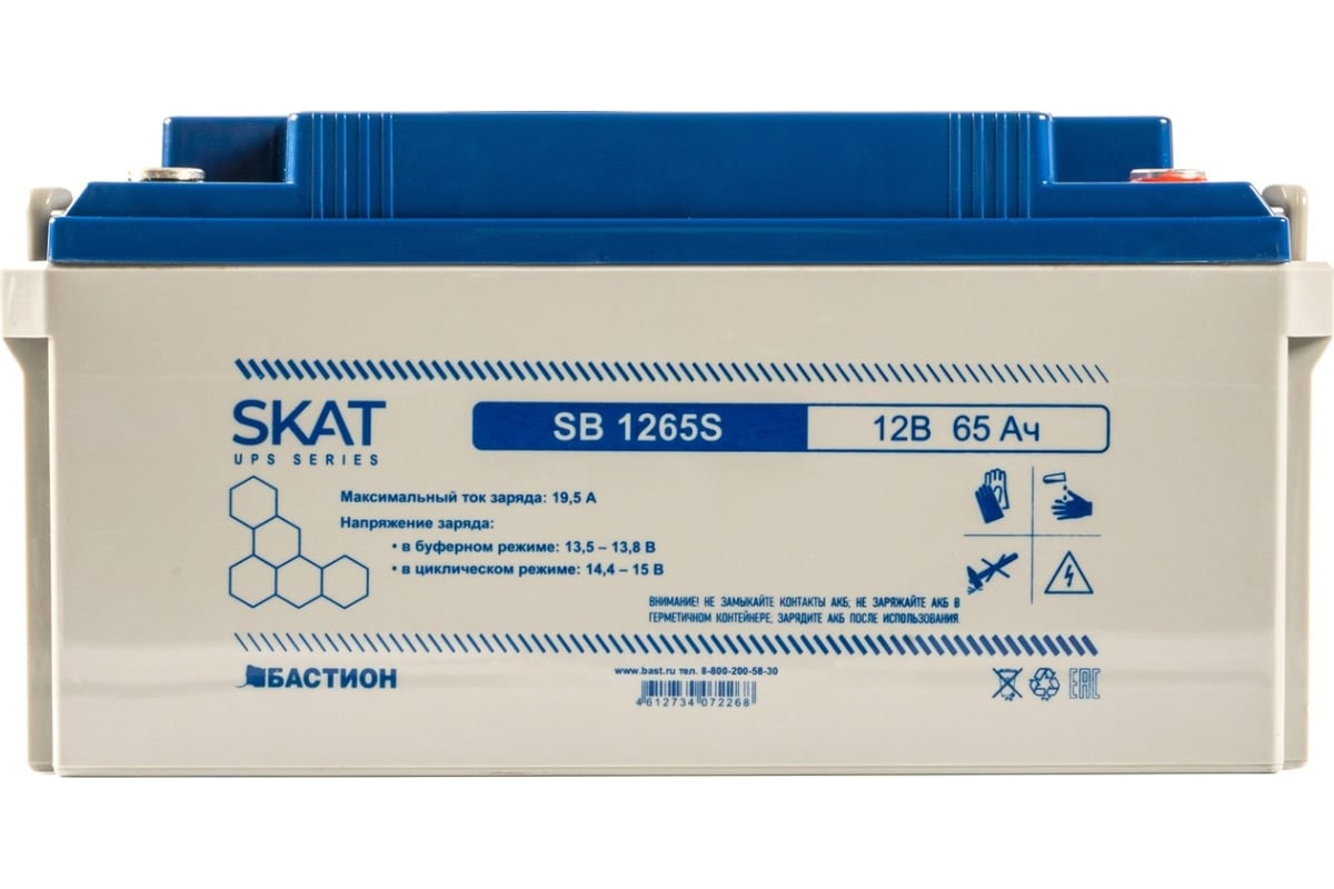 Аккумулятор герметичный свинцово-кислотный необслуживаемый SKAT SB 1265S, производимый по технологии AGM (Absorbent Glass Mat) с системой рекомбинации газов VLRA, предназначен для использования в составе системы резервного питания.