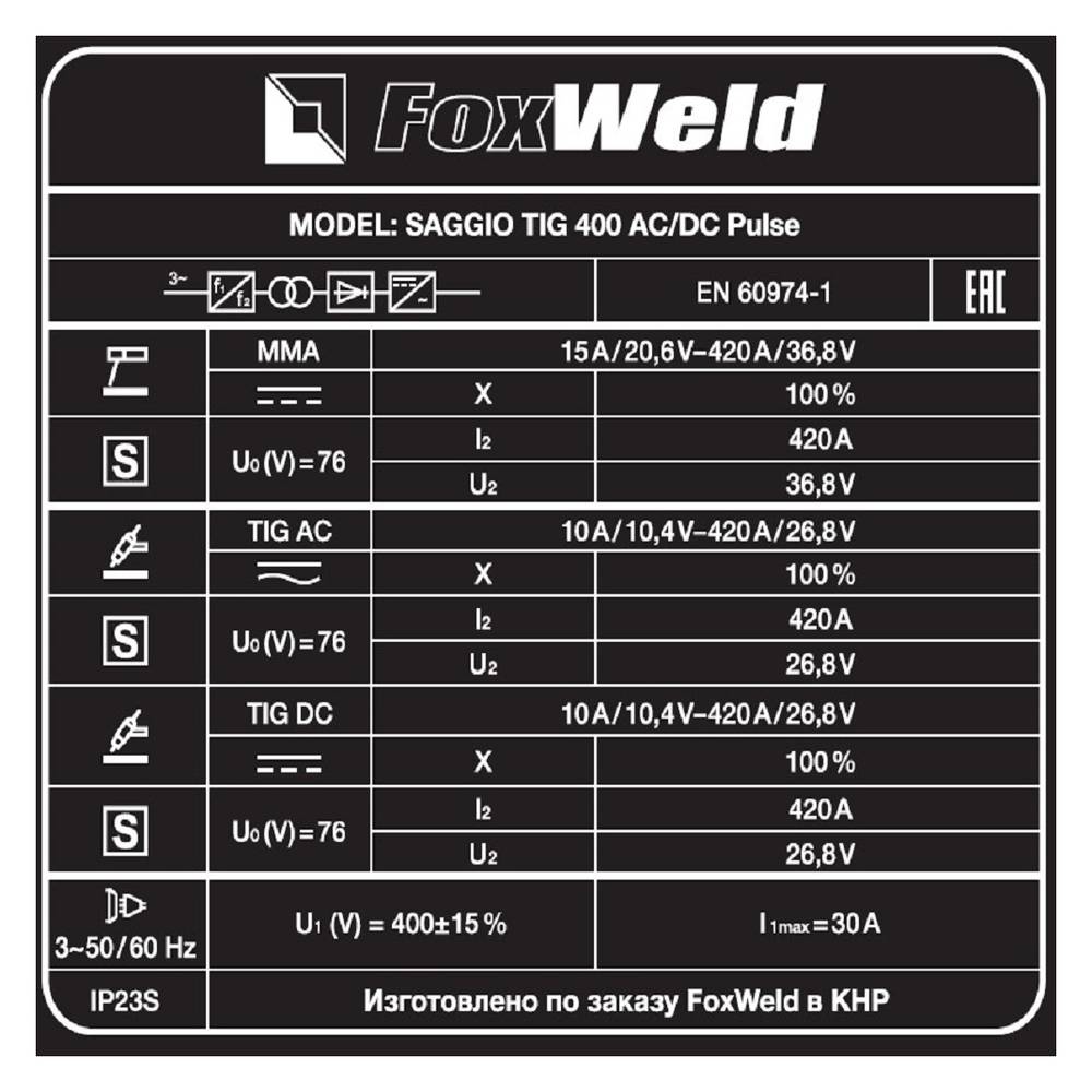 Сварочный аппарат аргонодуговой сварки FOXWELD SAGGIO TIG 400 AC/DC PULSE – это промышленная флагманская установка серии SAGGIO для аргонодуговой сварки TIG. Аппарат предназначен для работы как на постоянном (сварка сталей, меди, титана), так и на переменном токе (сплавы алюминия, магния, медные сплавы больших толщин, где требуется удаление окислов со свариваемой поверхности), в импульсном режиме и без него. Импульсный режим идеально подойдёт для сварки тонких металлов, особенно алюминия. 2 цифровых дисплея на панели управления и циклограмма рабочего процесса отображают параметры сварки в реальном времени. Максимальный сварочный ток в 420 ампер в любом режиме сварки, ПВ (продолжительность включения) 100% на максимальном токе, 2 мощные ручки на корпусе, платформа на колёсах, установочное место для баллона с газом, возможность подключения пульта или педали дистанционного управления сварочным током – в установке есть всё необходимое для крупных промышленных производств и строительства.