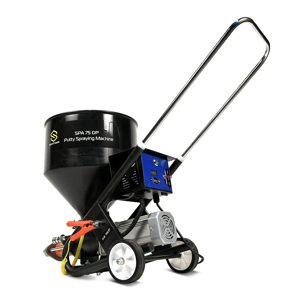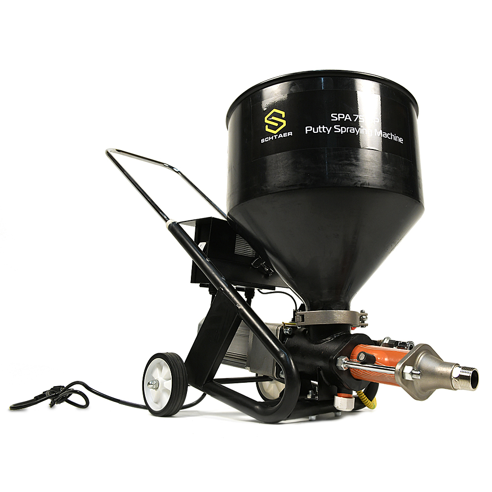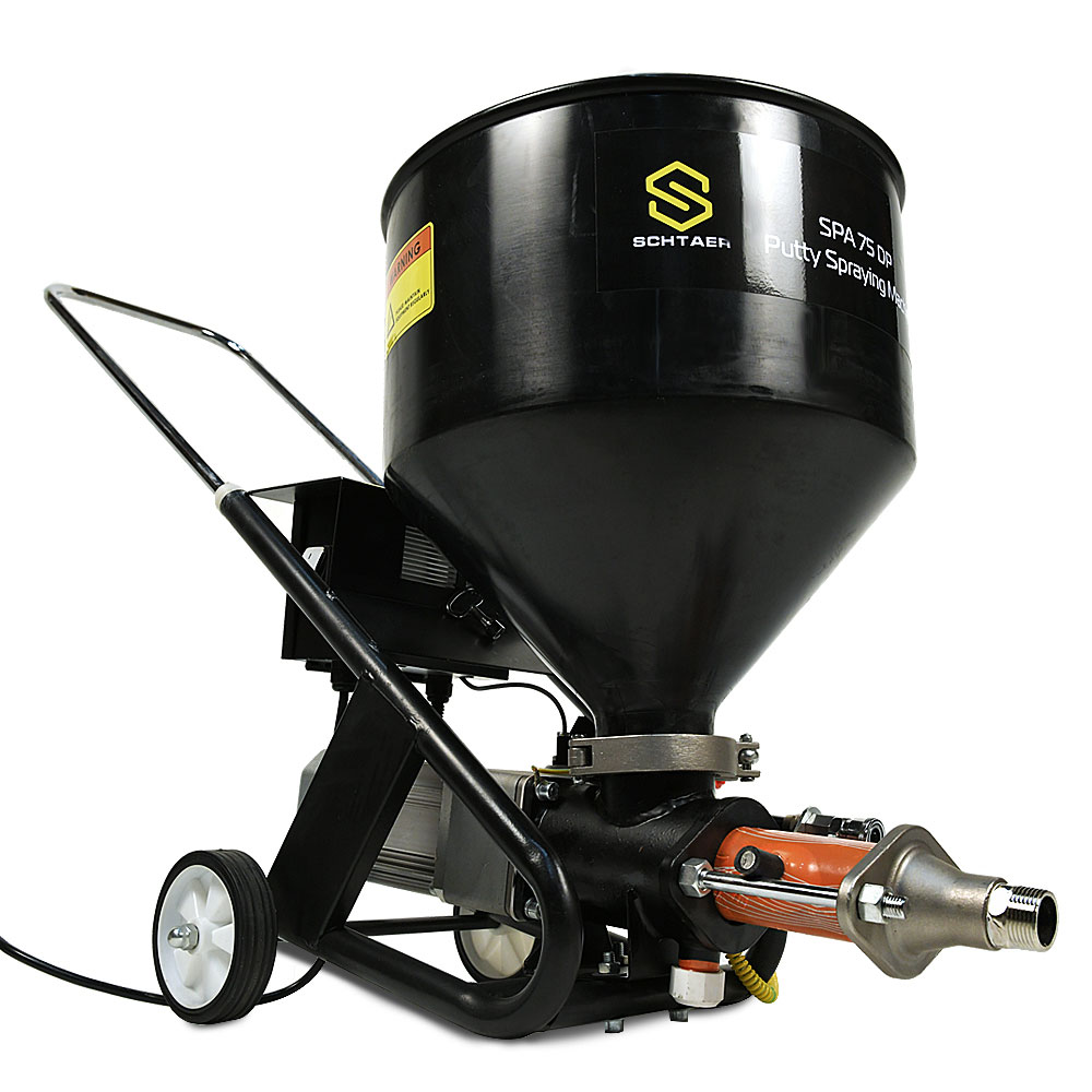Schtaer SPA 75 DP – аппарат для нанесения шпаклевки. Установка обеспечивает мягкое и равномерное покрытие с помощью плавной регулировки объема подаваемого материала. Материал покрытия подается из бака. Спиральный конвейер подает материал покрытия на эксцентриковый шнековый насос. При всасывании материал покрытия поступает в эксцентриковый шнековый насос. Этот насос создает давление, необходимое для транспортировки строительного раствора через шланг. Сжатый воздух, требуемый для атомизации, подается в распыляющую насадку. Установку для распыления строительного раствора можно включать и выключать с помощью электрического переключателя.