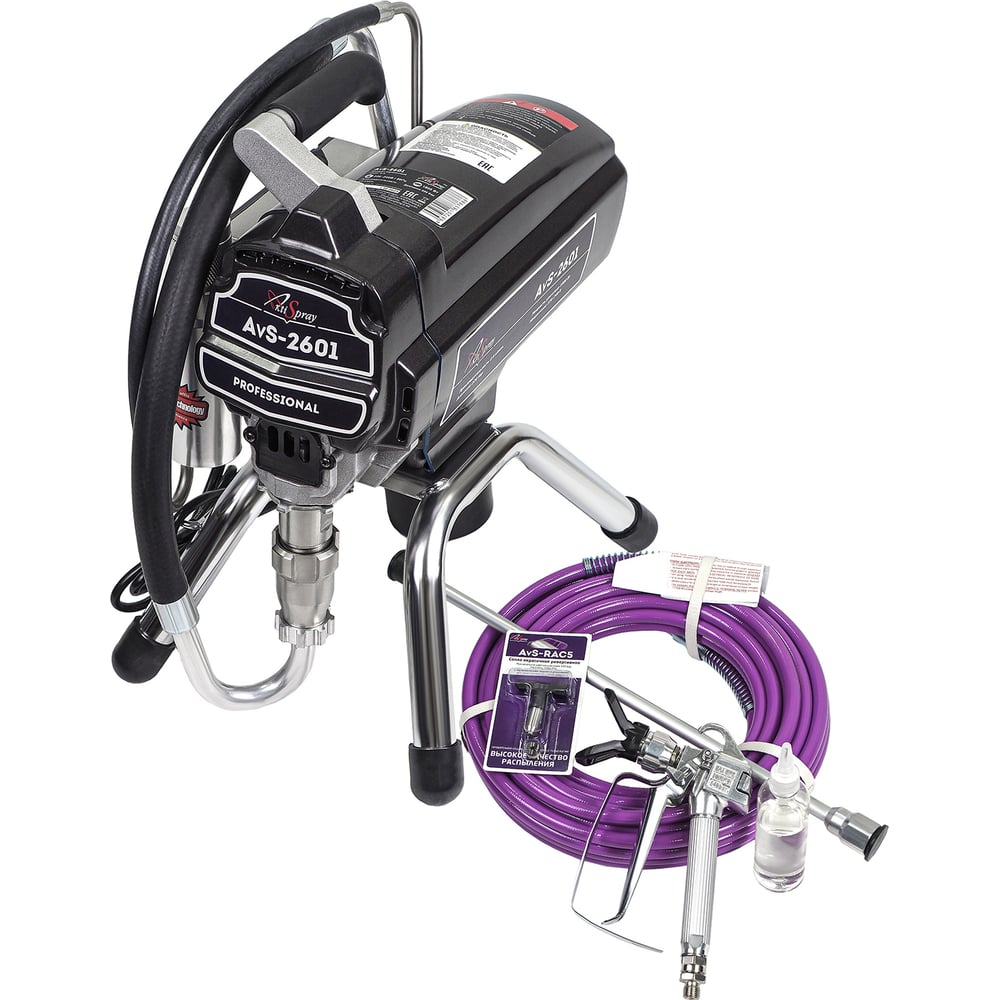 Окрасочный аппарат AktiSpray комплект, 2,6 л/мин, 220 бар, 1800 Вт, 220 В, 50 Гц AvS-2601 высокой мощности и малых габаритов. Электронная система регулировки давления позволяет точно поддерживать заданные параметры, что крайне положительно сказывается на качестве и однородности наносимого слоя краски. Бесщеточный двигатель высокой мощности с малыми габаритами обеспечивает высокий крутящий момент, и при этом, вследствие своей конструкции, не образуются искры, как это присутствует на щеточных электродвигателях. Небольшой вес аппарата и небольшие габариты, дают возможность использовать аппарат в ограниченном пространстве и различных высотах, а мобильность аппарата делает транспортировку достаточно быстрой.