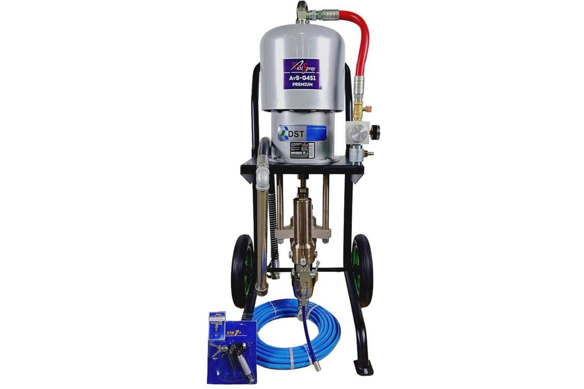 Профессиональный покрасочный агрегат высокого давления AvS-G451 Premium главным преимуществом которого является их очень высокая надежность вследствие простоты конструкции. При этом окрасочные аппараты с пневмоприводом могут распылять самые вязкие материалы, которые не способны распылять аппараты с другими типами приводов. По этой причине этот вид окрасочных аппаратов применяется на производствах, где имеется сжатый воздух и надежность является определяющим фактором при выборе окрасочного оборудования. И тем более если вязкие материалы способны распыляться только при более высоком рабочем давлении, по сравнению с окрасочными аппаратами с другой конструкцией.