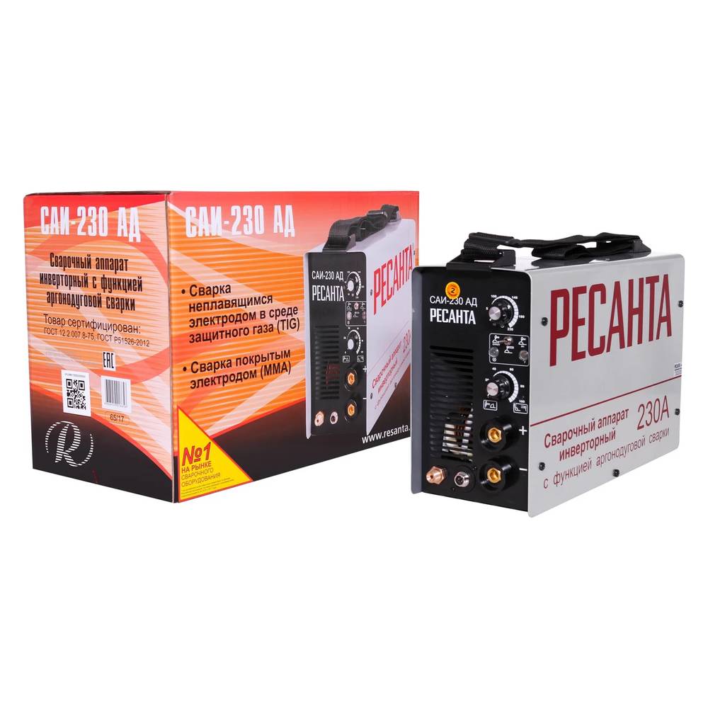 Сварочный аппарат Ресанта САИ-230 АД - портативный инверторный сварочный аппарат с функцией аргонодуговой сварки. Это универсальный агрегат, который используется для сварки металлических конструкций вольфрамовым электродом (TIG), а также сварки электродами с рутиловым покрытием (MMA). Есть регулировка времени убывания тока и силы дуги в режиме ММА.