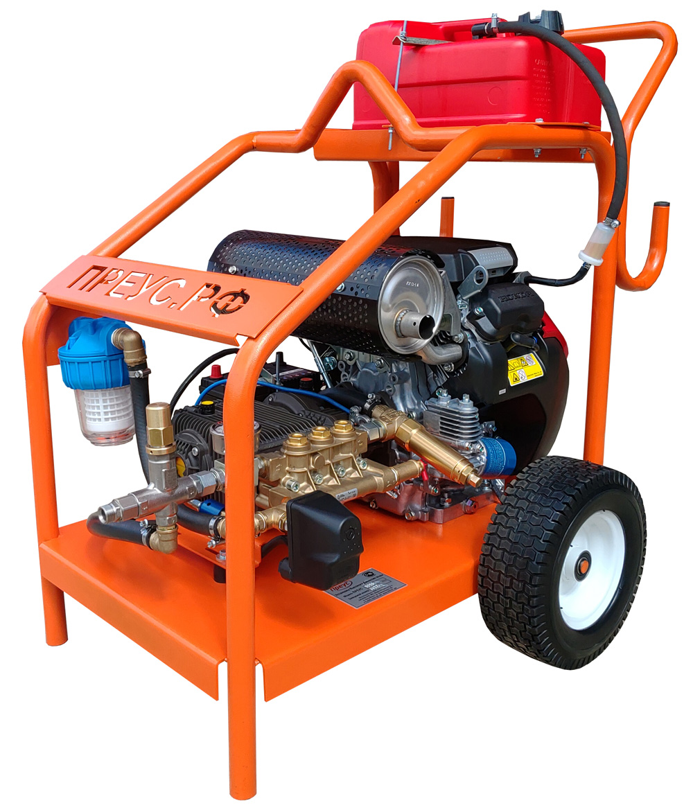 Аппарат высокого давления ПРЕУС Б5017 с бензиновым двигателем Briggs&Stratton Vanguard или Honda, рабочим давлением 500 бар с потоком воды 17 л/мин (1040 л/час). Оснащен высококачественным итальянским насосом высокого давления компании UDOR, что обеспечивает превосходную надежность и производительность. Применяется для: чистки различных поверхностей; гидродинамической прочистки канализационных труб; очистки старых покрытий для подготовки поверхностей под окраску; разрушения конструкций из бетона; стирания дорожных разметок; размораживания трубопроводов и ликвидации ледяных пробок; чистки паровых котлов и конденсаторов; мойки строительных машин; окорки бревен; чистки термодинамических камер и др.