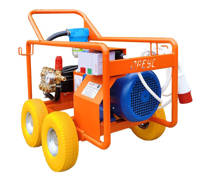 Аппарат высокого давления Преус Е2030А с электрическим трехфазным двигателем мощностью 11 кВт, приводящим в действие трехплунжерный итальянский насос Udor, который нагнетает рабочее давление в 200 бар. Расход воды достигает 30 литров в минуту. Насос прекрасно справляется с такими работами как очистка канализационных труб, дымоходов и других труб диаметром от 50 до 300 мм на длину до 40 метров. Установка смонтирована на прочной металлической раме с транспортировочными колесами, что позволяет легко перемещать установку по обслуживаемому объекту.