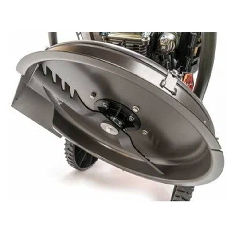 Оснащена большими колесами для хорошей тяги и поворотным передним колесом для оптимальной управляемости. Выполняет стрижку и выброс травы в сторону.