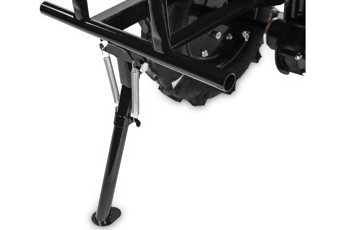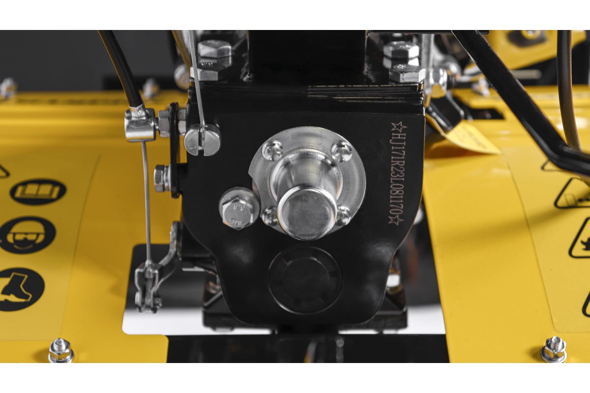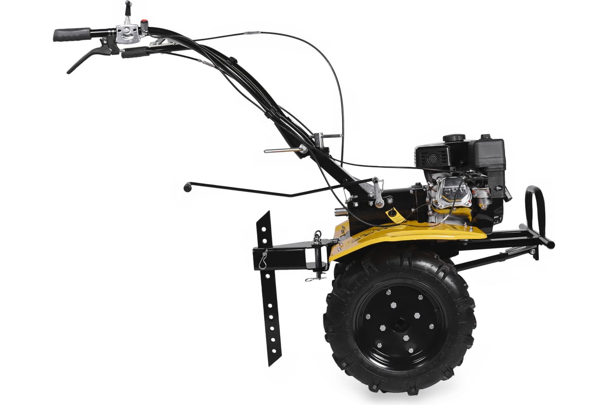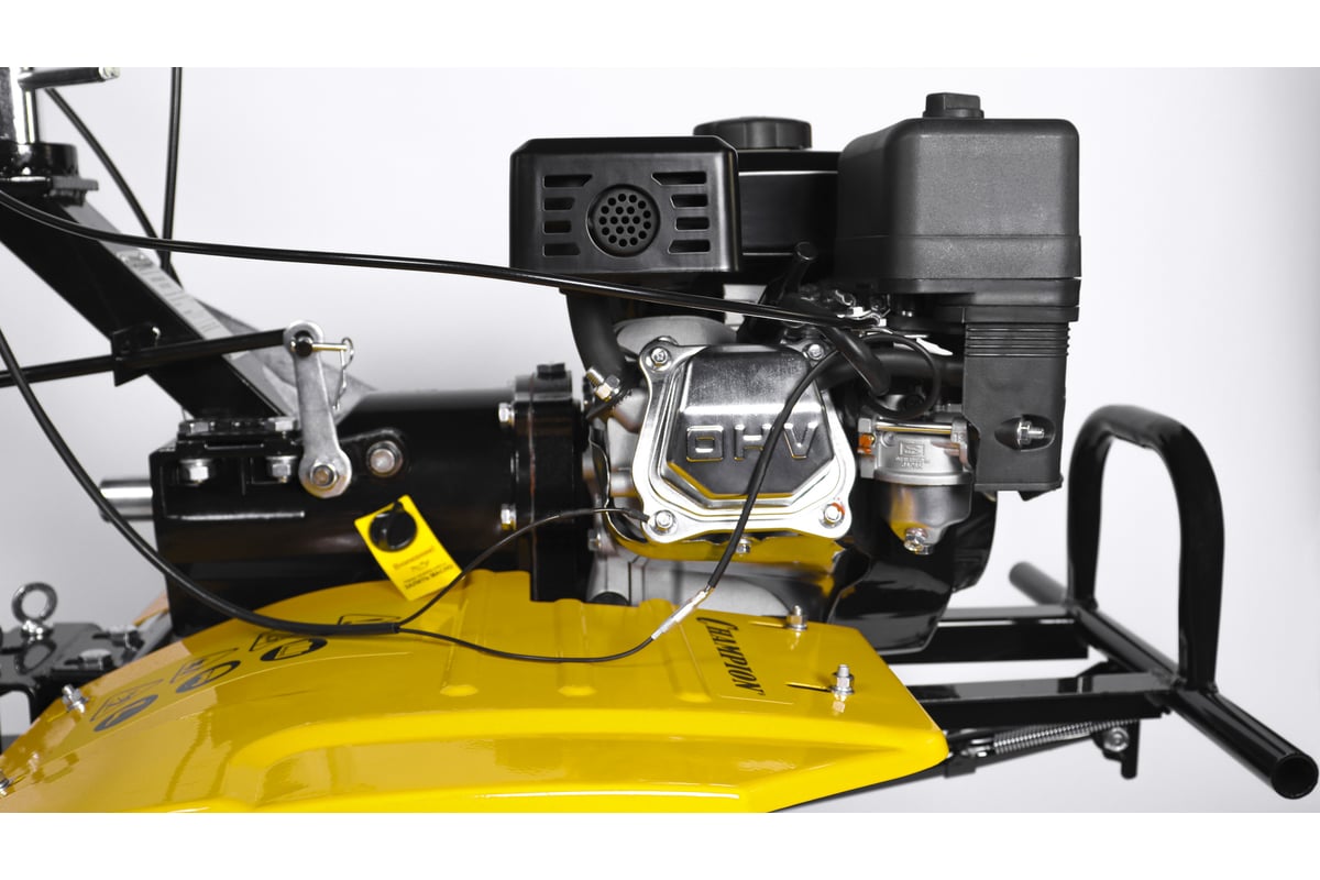 Мотоблок оснащен пневматическими колесами, что упрощает перемещение агрегата по рабочей территории, и двигателем мощностью 7 л.с. Топливный бак имеет широкую горловину для удобства заливки бензина.