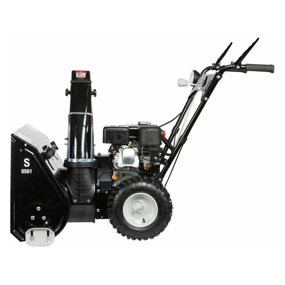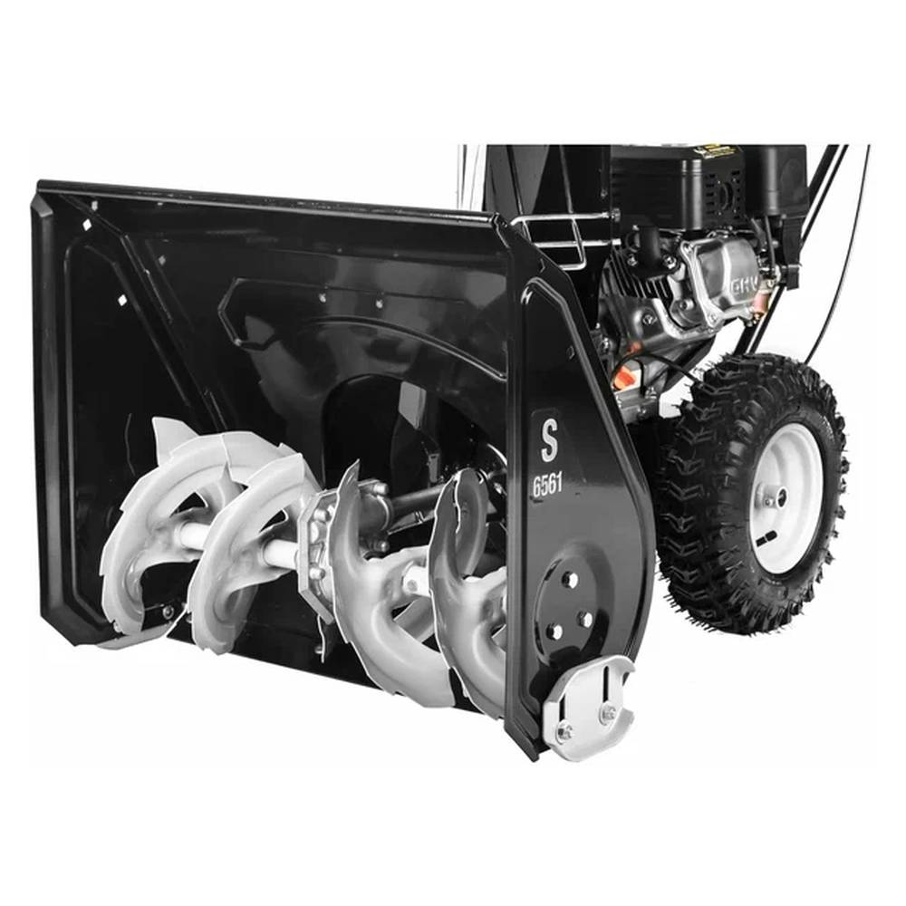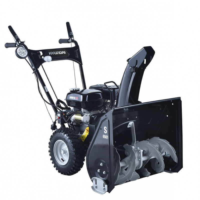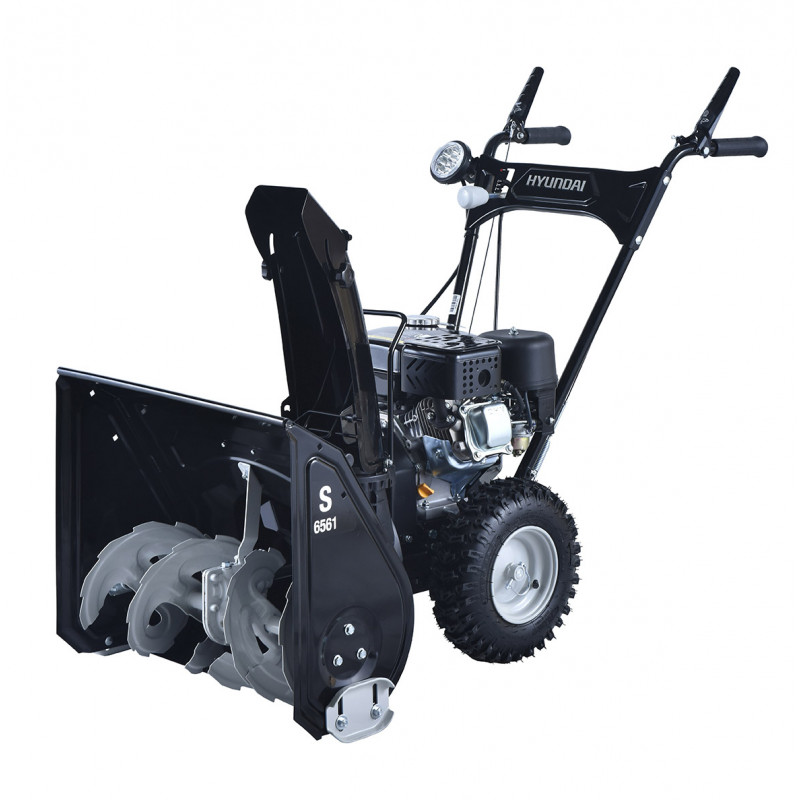 Самоходный бензиновый снегоуборщик Hyundai S 6561, с оптимальной для дачи и загородного дома шириной захвата снега 61 см. Мощность бензинового четырехтактного мотора составляет 6.5 л/с. Снегоуборочная машина с ручным запуском, и электростартером от сети 220 Вольт. Фара позволят убирать снег в темное время суток. Скорости передвижения 4 вперед, 1 назад.