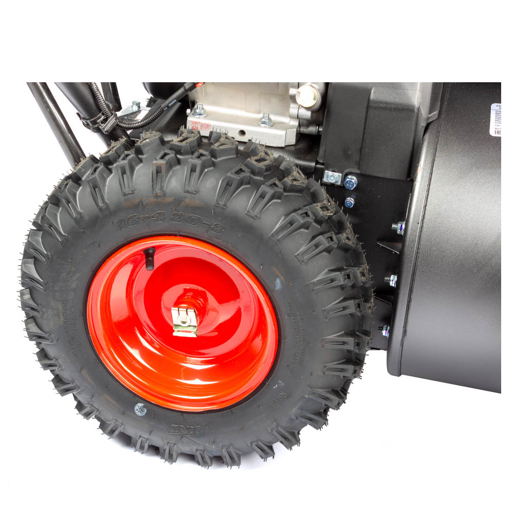 Оснащен двигателем B&S 1450 SNOW SERIES специальной зимней серии, который заводится при пониженных температурах и не требует ухода за воздушным фильтром ввиду его отсутствия. Благодаря мощному мотору снегоочиститель без затруднений за один проход освобождает от снега полосу шириной в 71см. Легко справляется с сугробами высотой до 54см. Запуск двигателя осуществляется электростартером, питающимся от электросети 220 вольт. Для облегчения маневрирования тяжелой машиной предусмотрена разблокировка колес, осуществляемая с панели управления. Шины на колесах имеют агрессивный и глубокий протектор для снижения возможной пробуксовки при уборке больших сугробов из слежавшегося или плотного снега.