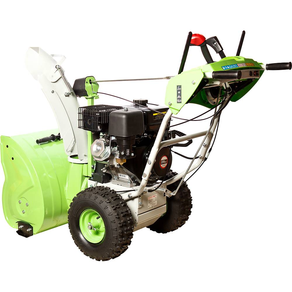 Оборудование имеет отличные параметры – ширина рабочего ковша 670 мм и высота забора снега 535 мм позволяет расчистить большую территорию всего за несколько минут. Двухступенчатая система очистки справляется со слежавшимся плотным снегом. Металлические шнеки размалывают снег, а крыльчатка разбивает его на мелкие комья.