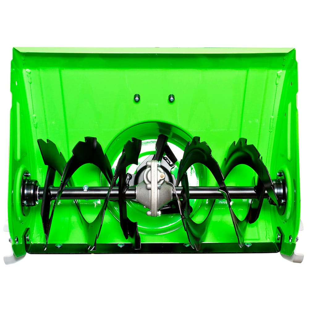 Рабочая ширина захвата составляет 560мм, максимальная высота снежного покрова ограничена размерами верхней части ковша – 430мм. Благодаря металлическим зубчатым шнекам размером и крыльчатке, снегоуборщик справляется со слежавшимися сугробами и настом. Узкая лопатка на длинной ручке позволяет очистить детали корпуса и патрубок от налипшего мокрого снега или достать неразмолотый снежный ком.