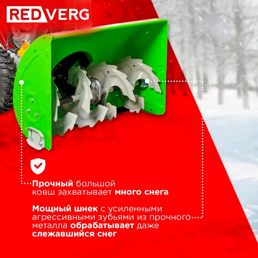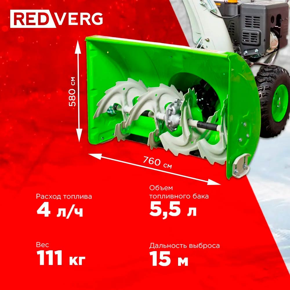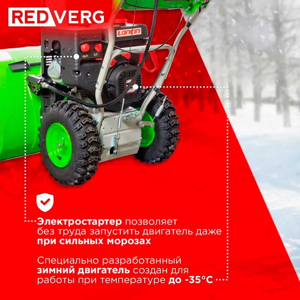Бензиновый снегоуборщик REDVERG RD-SB76/11E с системой регулировки дальности выброса снега, предназначен для уборки территорий. Оснащен системой электрозапуска от сети 220В, подогревом рукояток и светодиодной фарой.