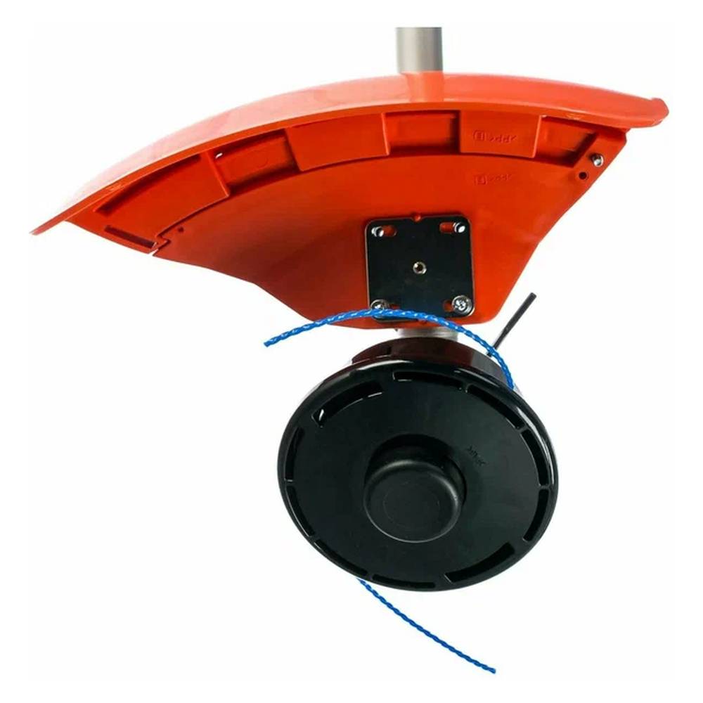 В качестве режущего инструмента используется полуавтоматическая триммерная головка с леской толщиной 3 мм или нож. Комбинированный поворотный кожух и защитные очки в комплекте делают работу безопасной.