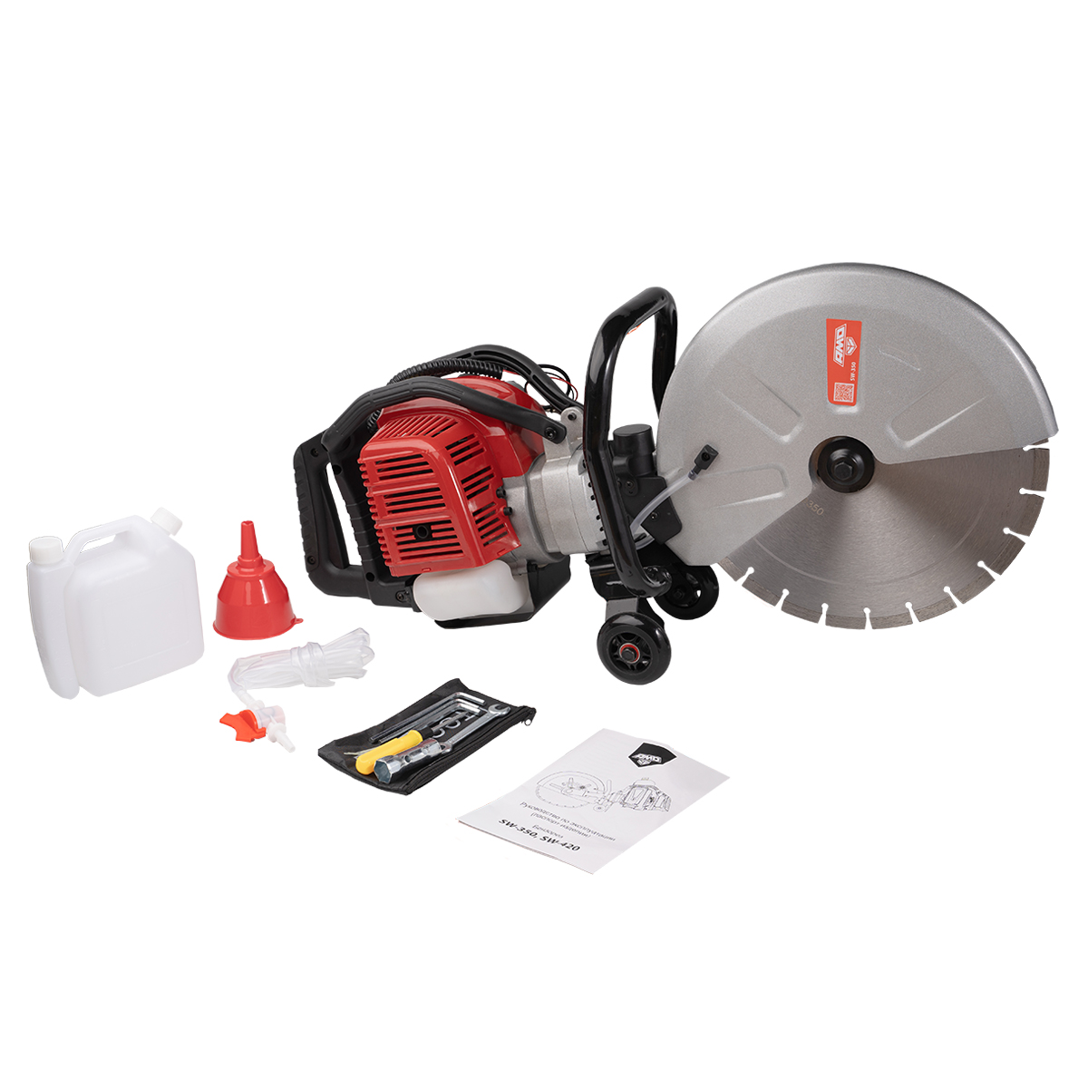 Бензорез AMO SW-350 - незаменимый инструмент для дорожников и строителей, представляющий собой профессиональное решение, ориентированное на демонтаж и ремонт. С его помощью можно с легкостью разрезать бетон, железобетон, кирпич, шлакоблоки и даже металлоконструкции при наличии соответствующей оснастки. В комплект входит алмазный пильный диск по бетону. Справится с любым материалом Одной из ключевых особенностей этого бензореза является его мощный двигатель, который развивает мощность в 1900 Вт. Благодаря этому, пильный диск диаметром 350 мм может достигать скорости вращения до 5000 оборотов в минуту. Такие характеристики позволяют выполнять резку с высокой эффективностью и точностью. Водяное охлаждение диска Одним из преимуществ бензореза AMO SW-350 является возможность осуществлять как сухую, так и мокрую резку. Для мокрой резки предусмотрена система подачи воды в рабочую зону, которая помогает снизить нагрев диска и продлить его срок службы. Благодаря этому, вы сможете работать без перерывов, а также уменьшите количество пыли, которую просто прибьет водой, что особенно важно при резке бетона в помещении. Заводится с пол-оборота Еще одним преимуществом является его быстрый запуск. Он оснащен регулировкой положения воздушной заслонки, праймером для подкачки топлива и ручным стартером, что позволяет быстро и удобно запустить мотор агрегата даже в холодную погоду. Удобство работы и обслуживания Конструкция бензореза AMO SW-350 также продумана до мелочей. Он имеет блокировку шпинделя для комфортной замены оснастки, регулировку наклона защитного кожуха, полезную при пилении под углом, и прочные колеса для удобства перемещения инструмента. Также есть возможность возможность подключить строительный пылесос для удаления пыли. Все необходимое - в комплекте Комплектация бензореза также заслуживает внимания. В набор входят все необходимые аксессуары: различные инструменты, такие как шестигранники, свечной ключ, отвертка и другие, которые помогут вам выполнить техобслуживание техники. Канистра для приготовления топливной смеси и воронка значительно упростят процесс дозаправки. Бензорез AMO SW-350 - это надежный и эффективный инструмент, который даст вам возможность справиться с самыми сложными задачами. Мощность, функционал, продуманная конструкция и комплектация делают инструмент идеальным выбором для профессионалов в строительной отрасли.