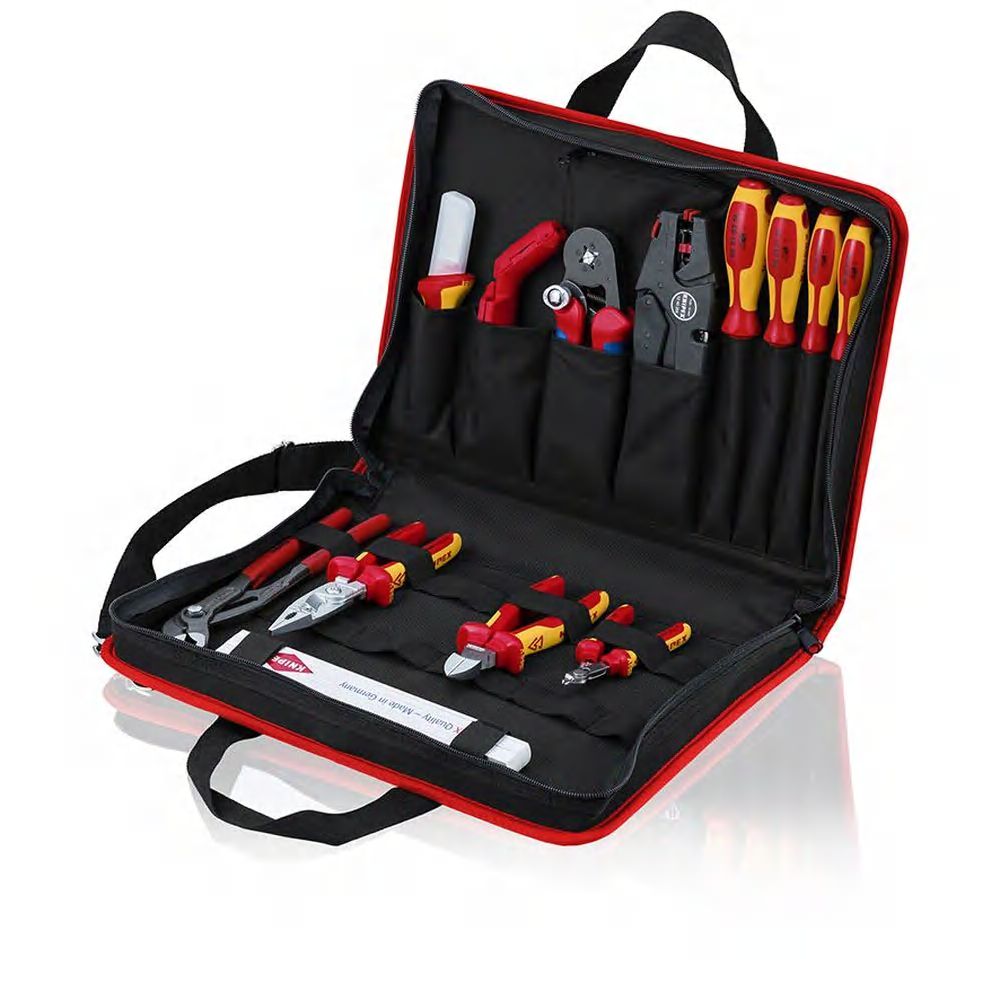 00 21 11 Compact сумка для инструментов Укомплектован 12инструментами KNIPEX; всего включает 13фирменных инструментов, в т.ч. электроизолированные в соответствии с DIN EN60900. Компактная инструментальная сумка для сервисных работ. Может использоваться в качестве вставки в инструментальных кейсах серии Basic 00 21 05 LE, BIG Basic Move 00 21 06 LE, BIG Twin Move 00 21 41 LE, BIG Twin 00 21 42 LE, BIG Twin Move RED 98 99 15 LE и других популярных моделях. с 8 карманами и 7 петлями для инструментов. вытягиваемая петля для крепления на тележке. из износостойкого полиэстера, с замком на молнии. Наружные размеры (Ш x В x Г): 410 x 60 x 290мм. - Размер: Ширина внешняя (внутренняя): 410mm - Размер: Высота внешняя (внутренняя): 60mm - Размер: Глубина внешняя (внутренняя): 290mm Комплект поставки: 1 x 12 40 200 KNIPEX Стриппер самонастраивающийся (0,03 – 10,0 mm2), 1 x 98 52 KNIPEX Нож для кабелей, 1 x 97 53 04 KNIPEX Самонастраивающиеся пресс-клещи для опрессовки контактных гильз с боковой у