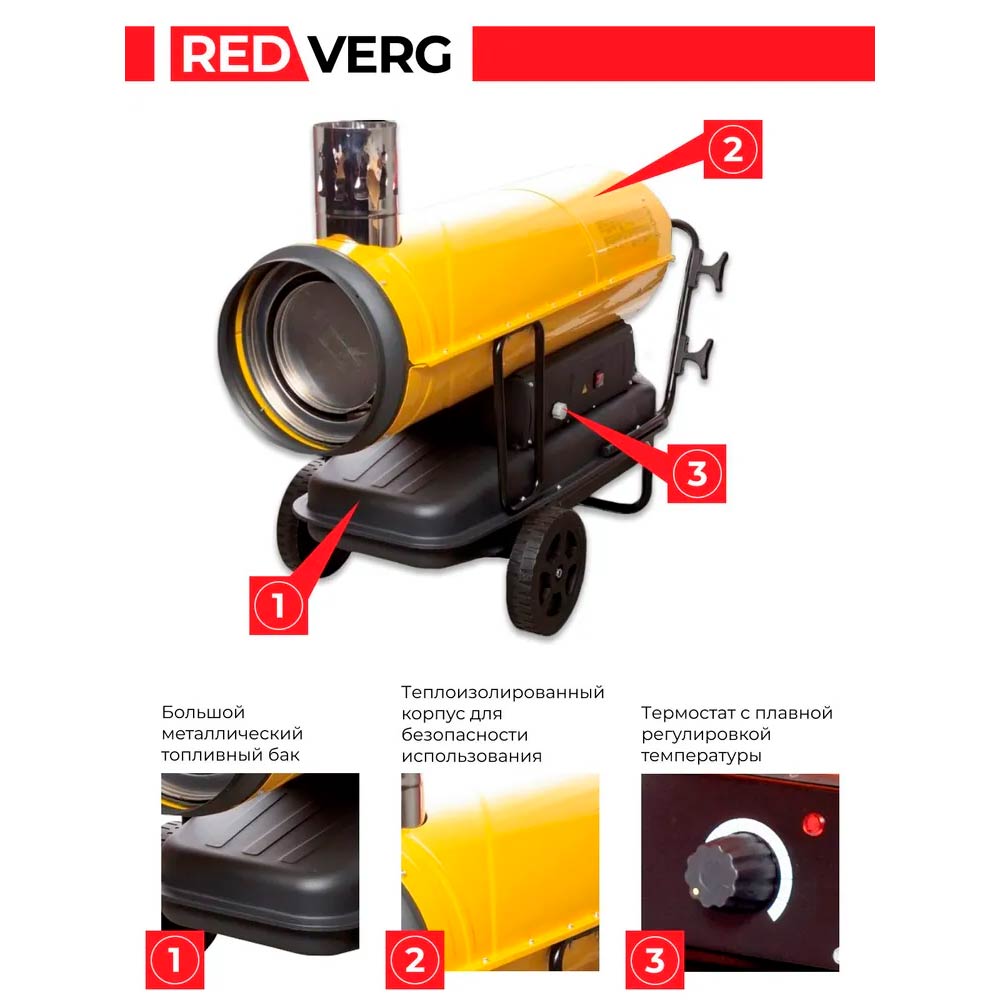Дизельный воздухонагреватель REDVERG RD-DHI20W относится к классу аппаратов с непрямым нагревом, то есть выхлопные газы отводятся за пределы обогреваемого помещения, с помощью дымохода. Несомненным преимуществом подобных устройств, по сравнению с пушками прямого нагрева, является «чистое» тепло, которое позволяет использовать аппараты в помещениях, где постоянно находятся люди. Оснащен регулируемым термостатом и цифровым дисплеем. Предназначен для обогрева жилых и нежилых построек и зданий (производственных и строительных площадок, складов, теплиц, цехов). Наличие рукоятки и колес обеспечивает удобство при транспортировке и перемещению с одного места на другое.
