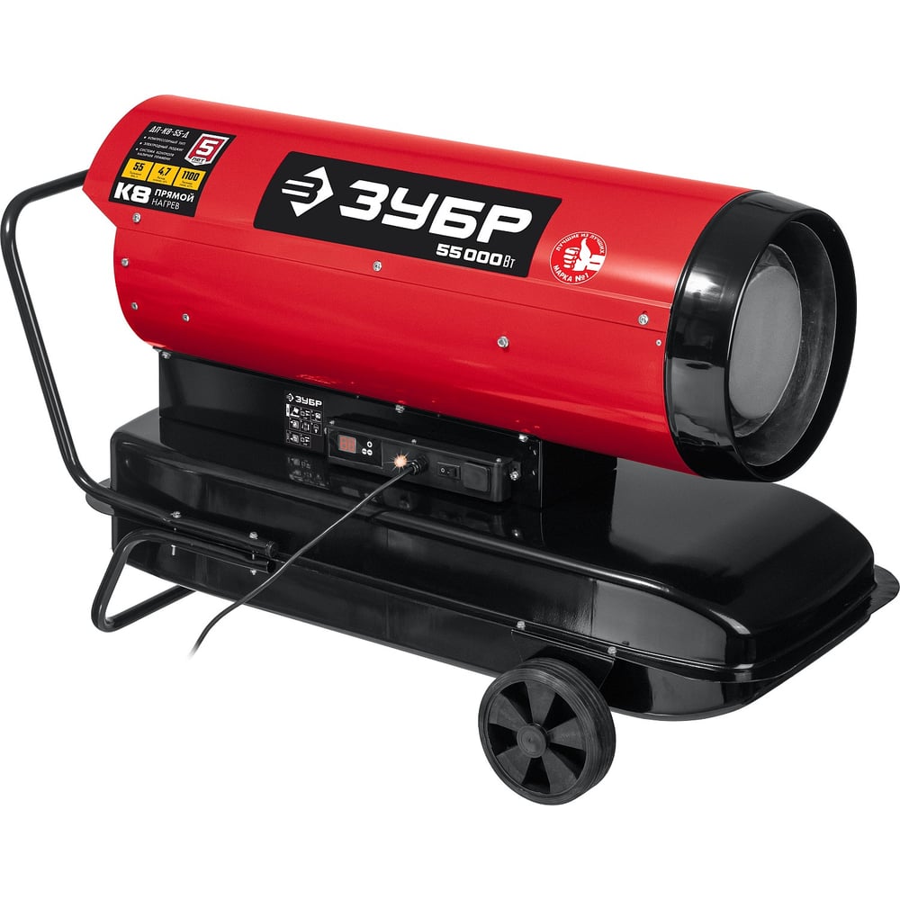 Дизельная тепловая пушка ЗУБР 55 кВт, прямой нагрев ДП-К8-55-Д имеет высокий уровень КПД, близкий к 100% за счет прямого нагрева. Двойной электрод из жаростойкой стали в керамическом изоляторе обеспечивает надежный поджиг горелки при минимальных потерях топлива и не требует очистки и замены. Электронный регулятор температуры и возможность подключения внешнего термостата позволяют использовать устройство в автономном режиме, автоматически поддерживая заданную для работы температуру.