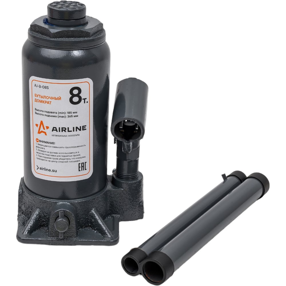 Бутылочный домкрат Airline S 8 т, MIN - 200 мм, MAX - 385 мм AJ-B-08S обладает простейшей схемой функционирования. Занимает мало места и не требует особых знаний в использовании. Единственное требование – хранение и транспортировка в вертикальном положении. В бутылочных домкратах серии STANDARD (индекс S) не используется предохранительный клапан.