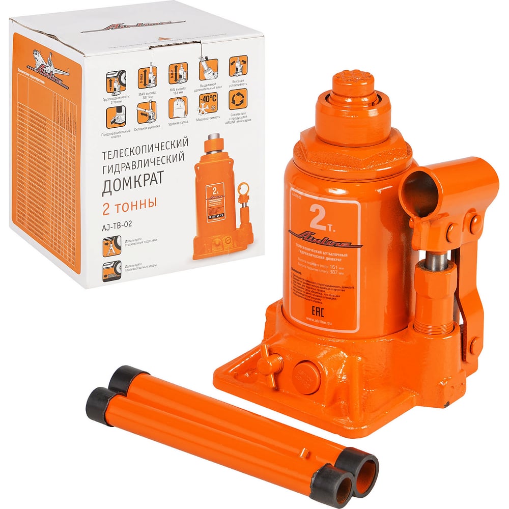Телескопический домкрат Airline 2 т, в сумке, MIN - 161 мм, MAX - 387 мм AJ-TB-02 позволяет поднять груз на высоту до 387 мм. Благодаря телескопическому штоку его ход увеличивается на 50% по сравнению с обычным 2-х тонным бутылочным домкратом. При этом сохраняется минимальная высота подхвата, что делает его удобным при использовании для джипов.
