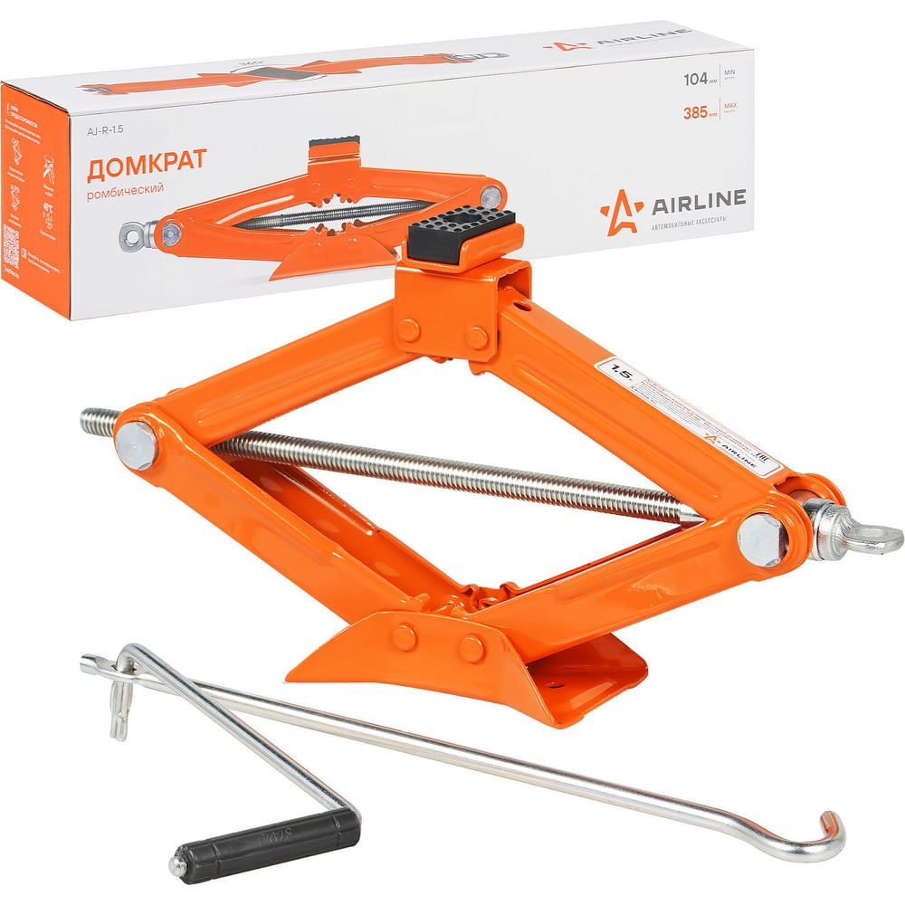 Ромбический домкрат Airline 1.5 т, MIN - 104 мм, MAX - 385 мм AJ-R-1.5 – это доступная возможность произвести ремонтные работы в полевых условиях. Обычно именно таким типом домкрата комплектуются легковые машины на конвейере. При этом он может храниться в любом месте и в любом положении. Не требует дополнительного ухода или обслуживания. Главными достоинствами являются внушительная высота подъема и прорезиненная верхняя упорная площадка (седло).