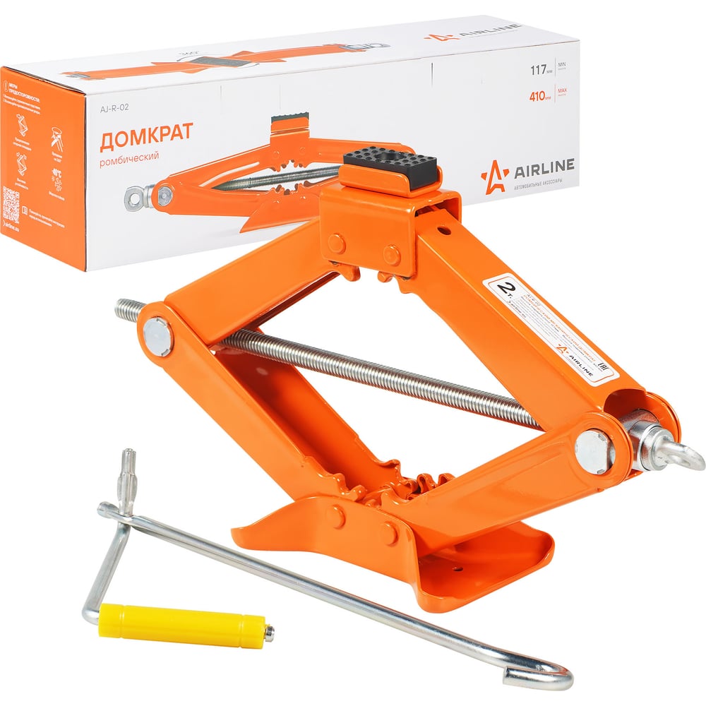 Ромбический домкрат Airline 2т, MIN - 117 мм, MAX - 410 мм AJ-R-02 – это доступная возможность произвести ремонтные работы в полевых условиях. Обычно именно таким типом домкрата комплектуются легковые машины на конвейере. При этом он может храниться в любом месте и в любом положении. Не требует дополнительного ухода или обслуживания. Главными достоинствами являются внушительная высота подъема и прорезиненная верхняя упорная площадка (седло).