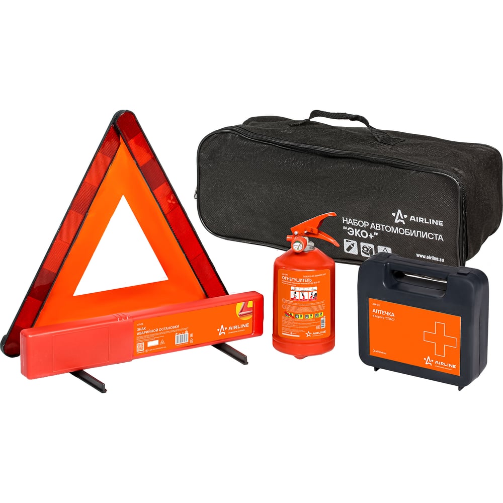 Набор автомобилиста Airline ЭКО+ ANA-03 оснащен базовой комплектацией необходимых каждому автомобилисту принадлежностей. В комплект включены средства первой необходимости, среди которых: знак, обозначающий экстренную остановку, огнетушитель ОП1, а также аптечка с перевязочным материалом для оказания первой медицинской помощи.