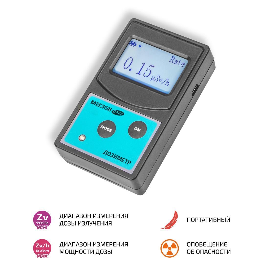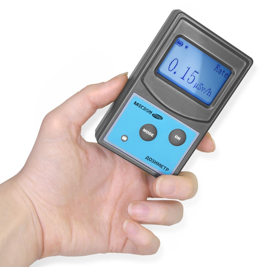 Дозиметр МЕГЕОН 07010 предназначен для обнаружения, измерения и контроля уровня радиации. Прибор использует в качестве детектора трубку Гейгера-Мюллера, обладает высокой чувствительностью, помехозащищённостью и точностью, позволяет измерять основные параметры ионизирующих излучений, такие как накопленная доза и мощность радиационного фона. Индивидуальный радиационный дозиметр оснащен жидкокристаллическим дисплеем с подсветкой, световой и звуковой сигнализацией о превышении установленных порогов, питается от двух батареек типоразмера ААА, имеет низкое энергопотребление, малый размер и вес. Удобный и простой в использовании инструмент может быть применён для проверки чистоты земельных участков, жилых и хозяйственных помещений, закупаемых материалов в частном строительстве и во многих других сферах.