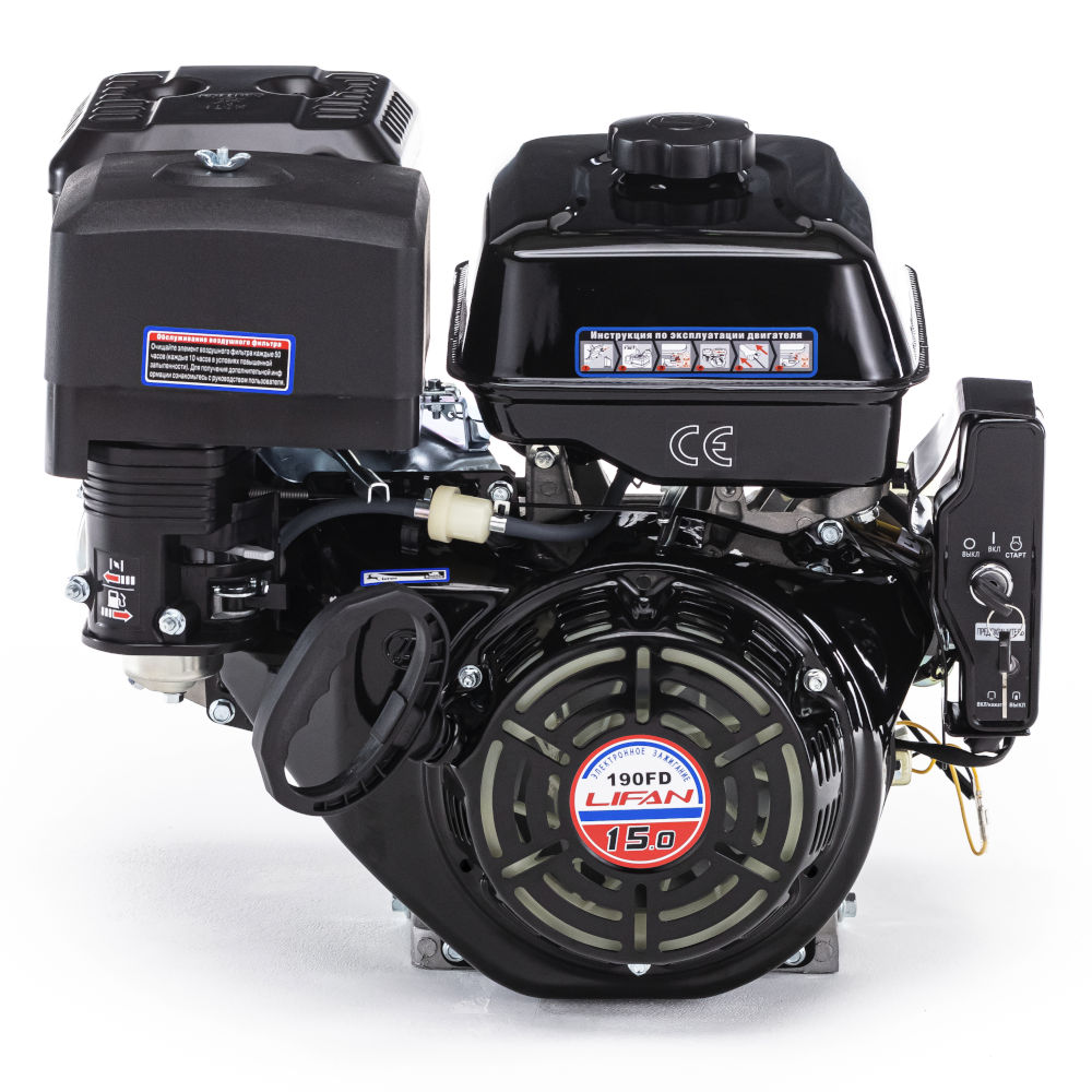 Двигатель бензиновый LIFAN 190FD предназначен для установки на различную технику бытового назначения, насосы и электрогенераторы. Данная модель весит всего 36 кг. Двигатель компактный по габаритам. Легко переносит длительные нагрузки за счет системы принудительного воздушного охлаждения. При низком уровне масла автоматика не даст двигателю завестись. Объема бака хватает на несколько часов бесперебойной работы. В представленной модели гильза цилиндра двигателя выполнена из чугуна, что позволяет увеличить в разы моторесурс двигателя. Также у данной модели есть электростартер, позволяющий за считанные секунды запустить Lifan 190FD. Но производитель предусмотрел и возможность запуска силовой установки с помощью ручного стартера, что является очень удобным.