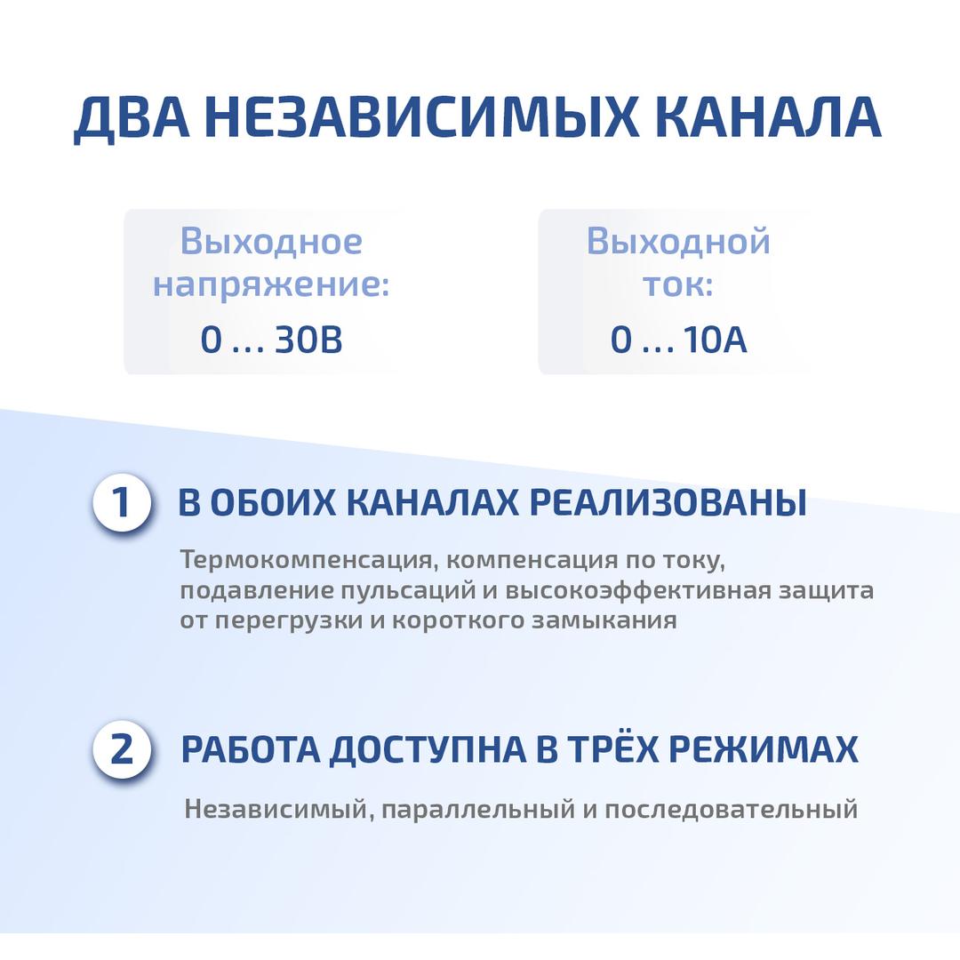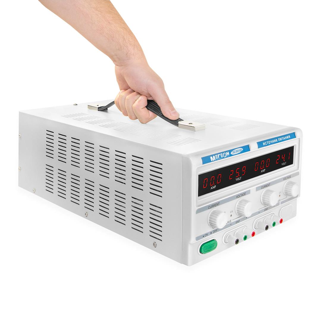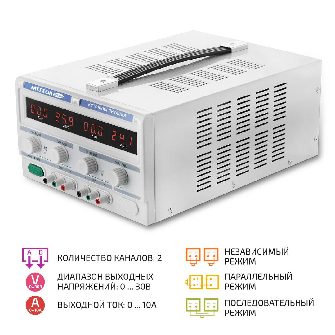 МЕГЕОН 323010 – это компактный, высокоточный, двухканальный источник питания. Содержит два независимых регулируемых канала с напряжением 0…30 В и током нагрузки 0…10 А. В обоих каналах реализованы: термокомпенсация, компенсация по току, подавление пульсаций и высокоэффективная защита от перегрузки и короткого замыкания. Работа доступна в трёх режимах: независимый, параллельный и последовательный. Подача и отключение напряжения осуществляется в одно нажатие. Благодаря плавной регулировке без разрыва потока мощности и раздельной цифровой индикации можно установить точно необходимые значения напряжения и силы тока. Прибор найдёт широкое применение в учебных и исследовательских целях, при разработке и ремонте радиотехнических устройств, кроме этого подходит для промышленного применения. Питатель по достоинству оценят профессионалы и любители.