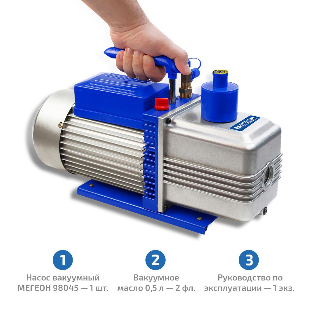 МЕГЕОН 98045 – это техническое средство представляющее собой электрический вакуумный двухступенчатый масляный насос, сочетающий в себе небольшие размеры, вес, высокую производительность и беспрецедентную надёжность. Удобная ручка для переноски, низкий уровень шума и невысокое энергопотребление делают его весьма привлекательным приобретением. Исключительные эксплуатационные характеристики достигаются благодаря новейшим разработкам, высококачественным материалам и изготовлению деталей на прецизионных станках. Он найдёт широкое применение при монтаже, наладке и ремонте бытового и торгового холодильного оборудования, домашних и автомобильных кондиционеров, в исследовательской деятельности и промышленном использовании, где необходимо откачать воздух до абсолютного значения 0,3 паскаля.