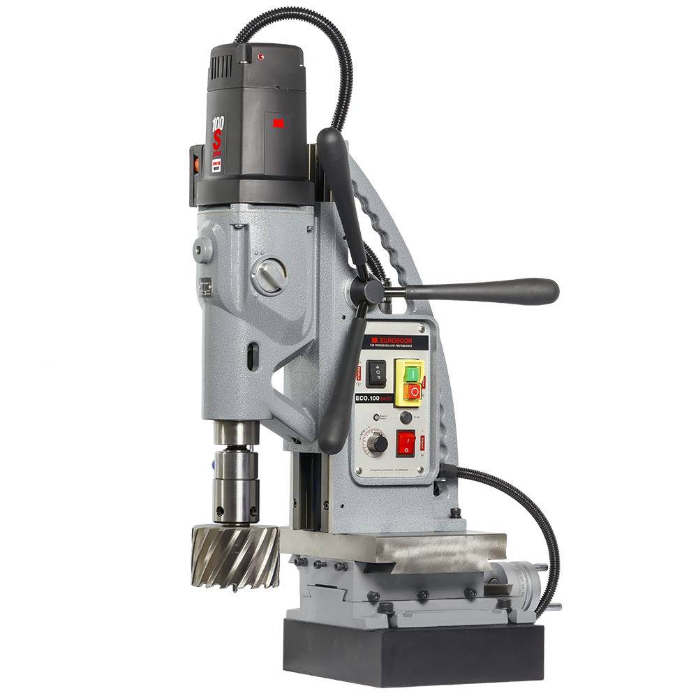 Сверлильный станок с магнитом Euroboor ECO.100S+/CT прорезает отверстия диаметром до 100 мм и особенно подходит для нарезания резьбы и мягкого фрезерования. Подвижное основание дает вам возможность позиционировать станок с высокой точностью в диапазоне 110 мм (ось X) и 120 мм (ось Y) после того, как магнит уже прикреплен к поверхности. Благодаря динамическому позиционированию во время процедуры сверления этот станок также можно использовать для мягкого фрезерования. Функция фрезерования дает возможность создавать пазы. Таким образом, можно обрабатывать даже более сложные детали на одном станке. Станок оснащен чрезвычайно мощным двигателем мощностью 1900 Вт, четырехступенчатой __коробкой передач с масляной смазкой и инновационной электроникой, обеспечивающей большую безопасность.