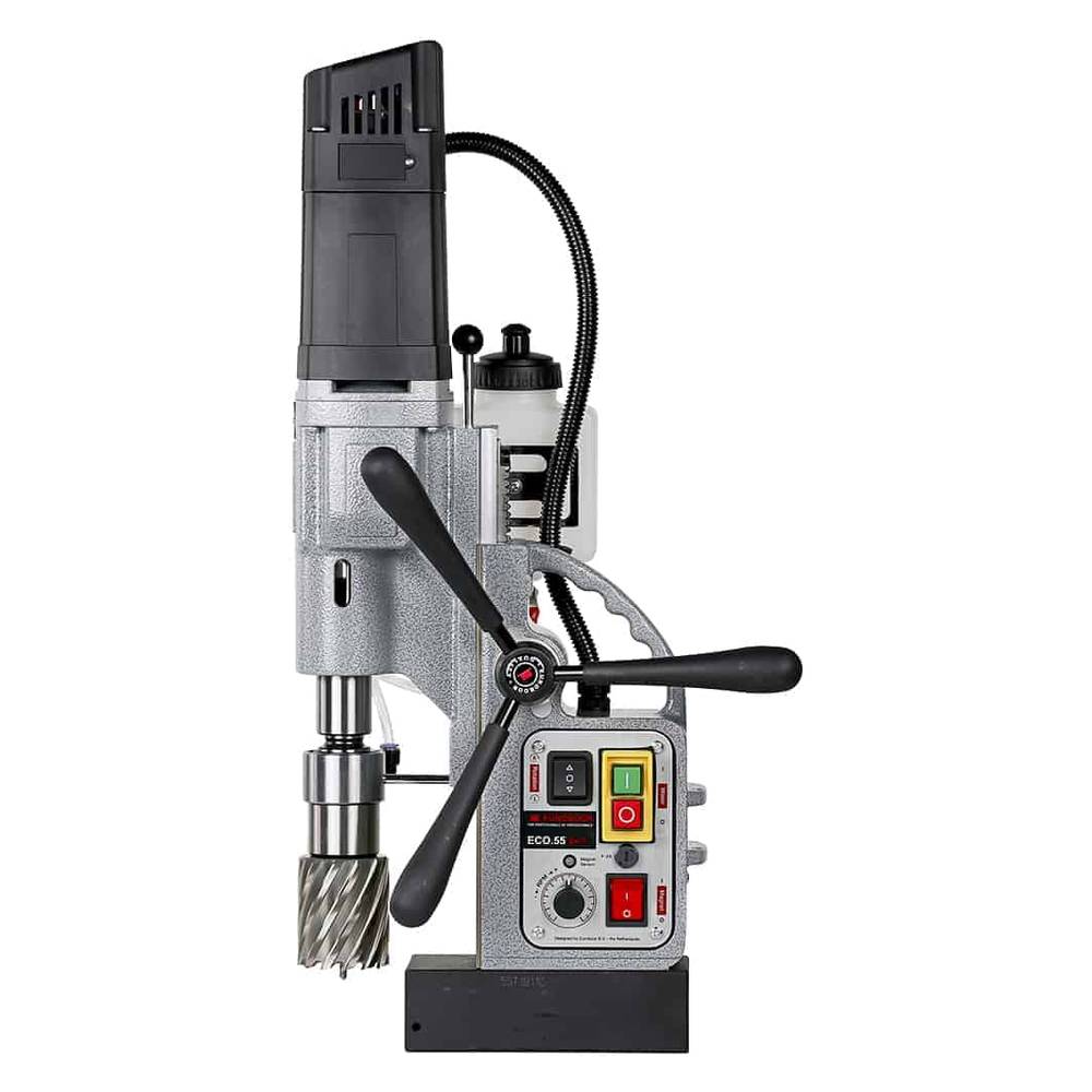 Станок на магните Euroboor ECO.55S+/T сверлит отверстия диаметром до 55 мм и хорошо подходит для нарезания резьбы благодаря функции реверса и электронной регулировки скорости. Этот станок на магнитной подушке имеет цифровой дисплей с информацией о потребляемой мощности и индикатор перегрузки.