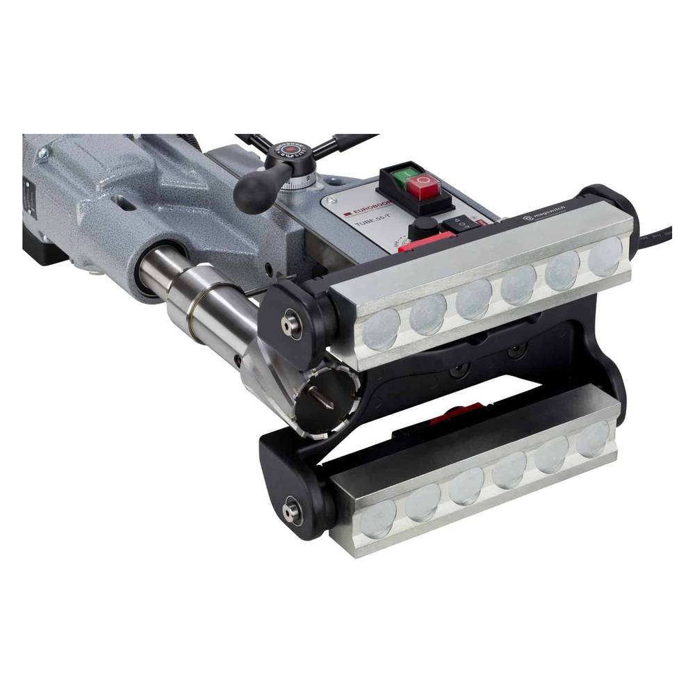 Сверлильный станок для сверления на изогнутых поверхностях Euroboor TUBE.55S+/T идеально подходит для нарезания резьбы и сверления сверления отверстий в трубах. Магнитное основание обеспечивает сцепление даже со сталью толщиной 3 мм. Магнит не требует электричества, что обеспечивает максимальную безопасность. TUBE.55S+/T оснащён цифровым дисплеем с информацией о потребляемой мощности и индикатором перегрузки, технологиями Smart Restart и GYRO-TEC.
