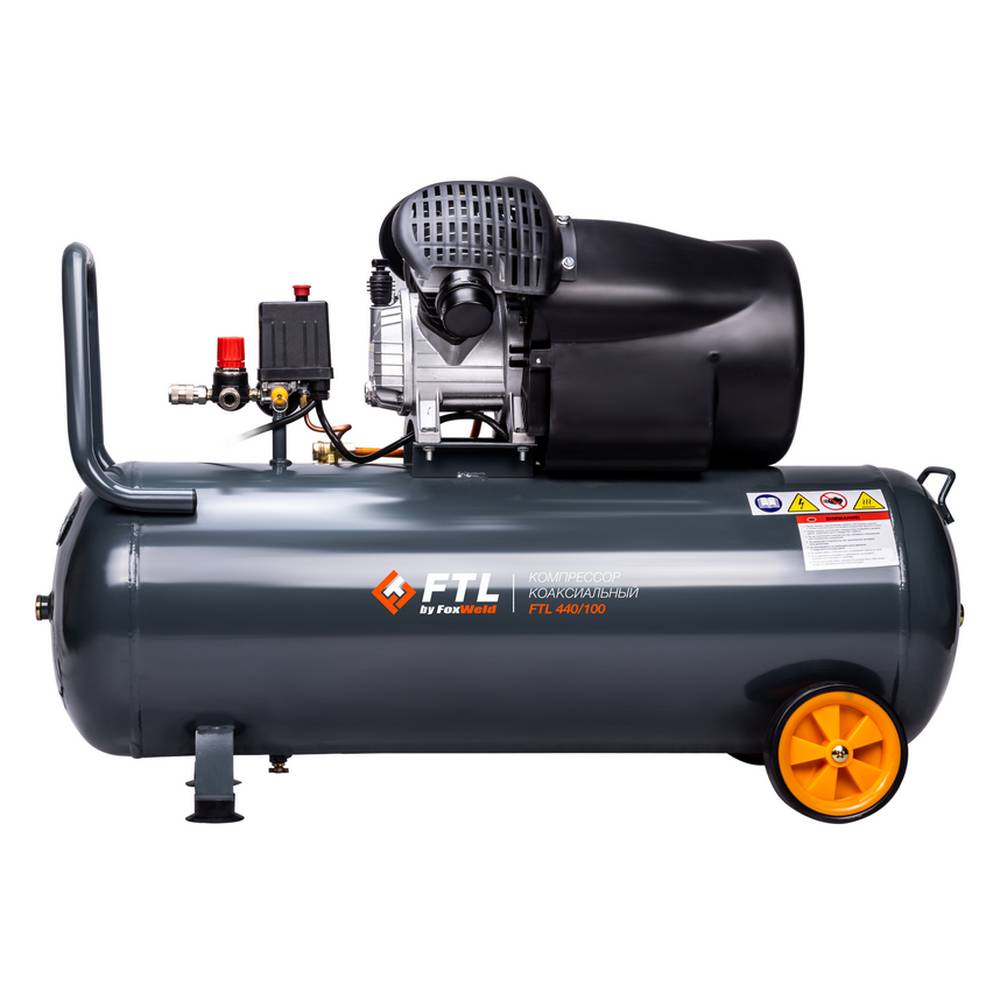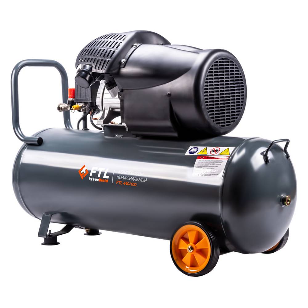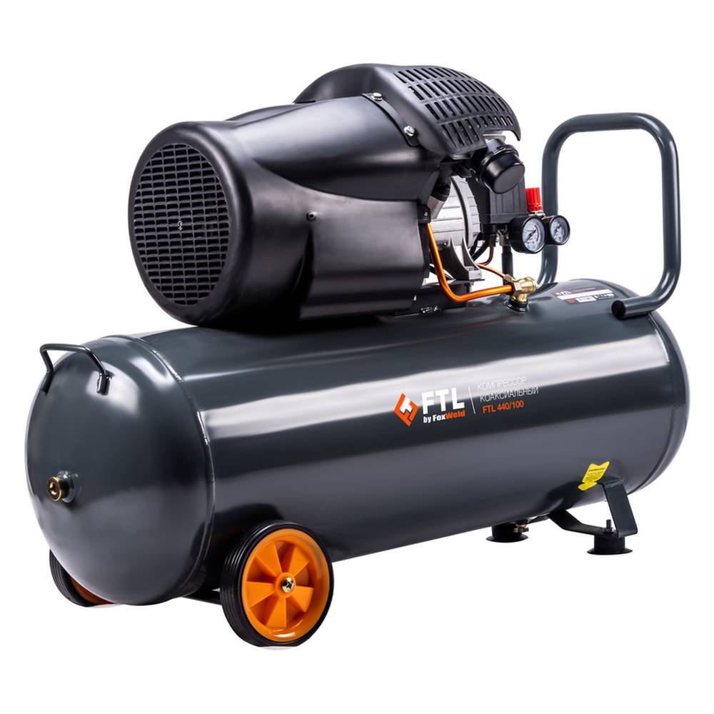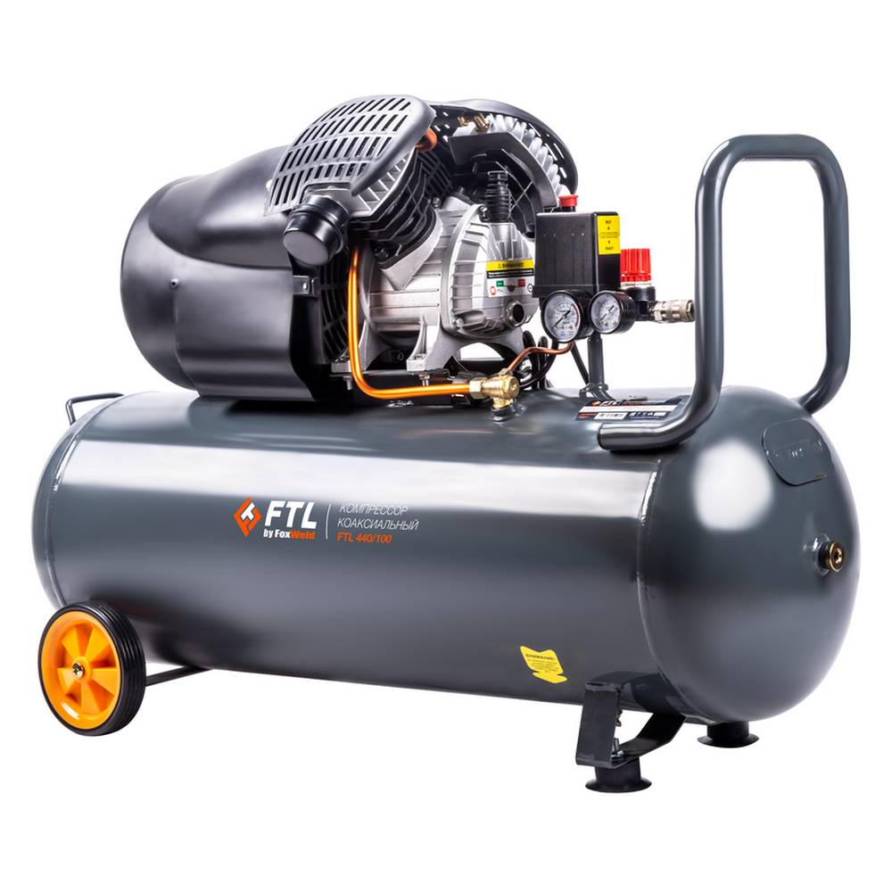 FTL 440/100 – воздушный двухпоршневой коаксиальный масляный компрессор с увеличенным объемом ресивера в 100 л. Отличается высокой производительностью в 440 л/мин благодаря использованию V-образной компрессорной головки с двумя цилиндрами с диаметром поршней 51 мм. За счет увеличенного объема ресивера обеспечивается более длительная бесперебойная работа подключаемых устройств и сохранение их стабильно высоких рабочих показателей. Данный компрессор будет оптимальным не только для наиболее требовательной категории частных владельцев, но также с пользой послужит и в области коммерческого применения, например, в автомастерских, для бригад мастеров, занимающихся строительством и ремонтом домов и коттеджей. Большой запас воздуха 100-литрового ресивера позволит работать с широким ассортиментом самого различного пневмоинструмента. Помимо прочего, рабочее давление в 8 бар позволяет использовать агрегат для самого широкого перечня сценариев применения. Модель оснащена автоматическим реле давления с манометром, аварийным (перепускным) клапаном и сливным краном для конденсата, вместительным масляным картером и встроенным редуктором с дополнительным манометром для установки выходного давления, а также двумя быстросъёмными выходами. Для удобства работы и гашения вибраций компрессор имеет две фронтальных прорезиненных опоры. Безопасность дополнительно гарантируется наличием большого обтекаемого кожуха, защищающего головки цилиндров и исключающего риск обжечься в случае непреднамеренного касания горячих рабочих поверхностей. Для удобства транспортировки предусмотрено наличие двух задних прорезиненных колес и U-образной рукоятки.