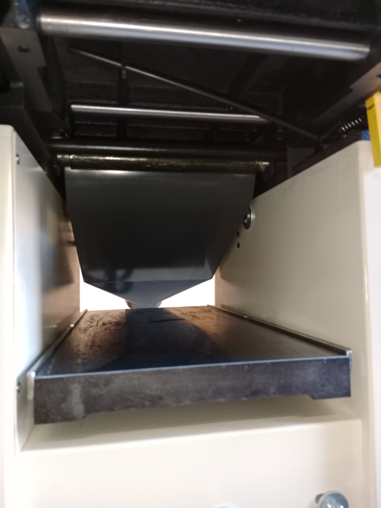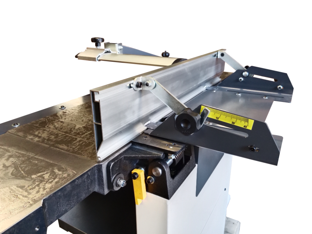 Верхний модуль может быть полностью поднят, не мешая работе и удалению стружки. Станок оснащен эксцентриковым механизмом для удобной регулировки положения подающего и отводящего столов. Стальной трехножевой строгальный вал входящий в базовую комплектацию прост в эксплуатации, надежен и не требует регулировки. Благодаря непрерывному входу ножа в заготовку, вал работает тихо и без вибрации. Скорость вращения 5500 об/мин обеспечивает чистоту реза. Для строгания вдоль кромки или под углом от 90 до 45 градусов станок оснащен параллельными упорами из жестких алюминиевых профилей.