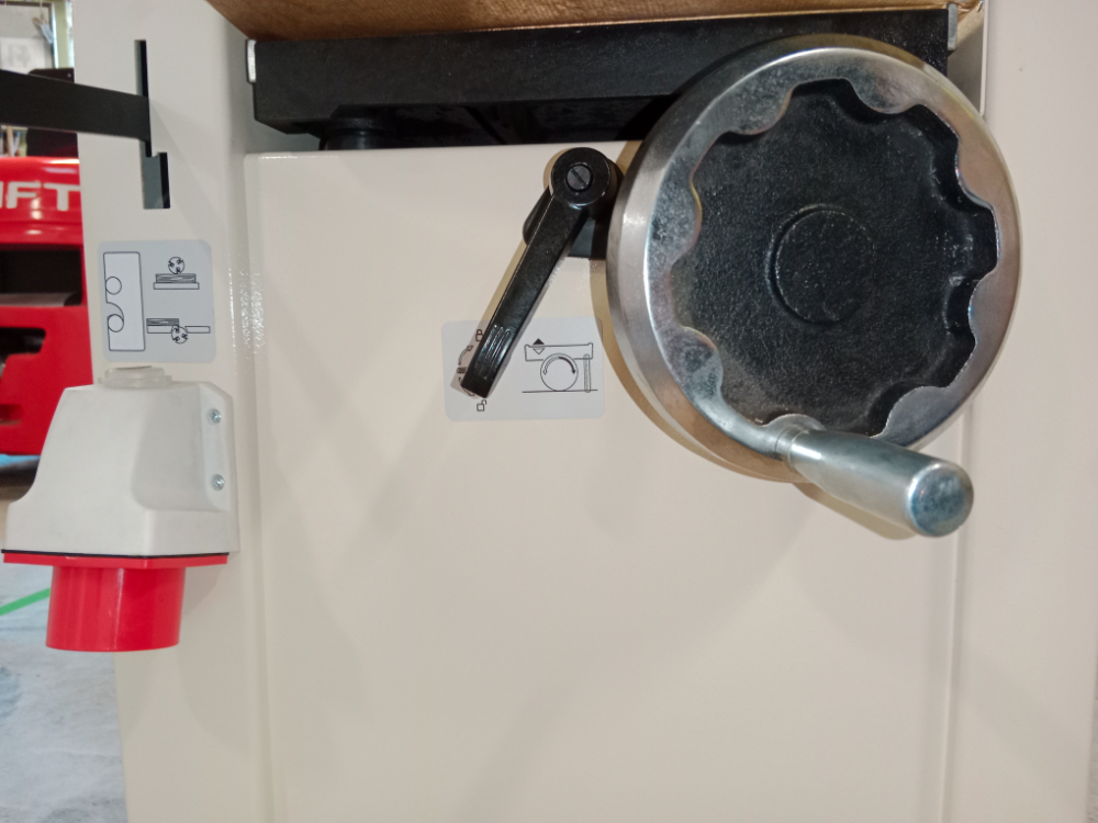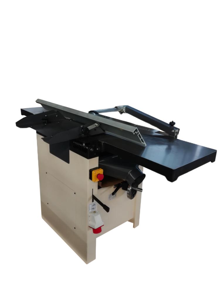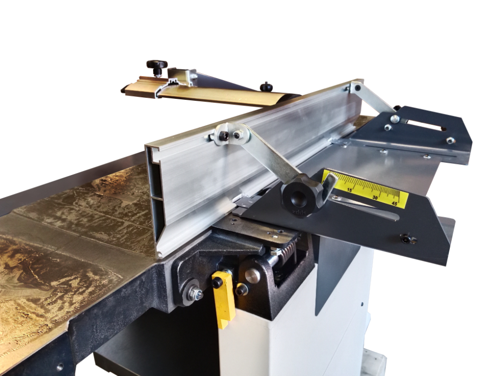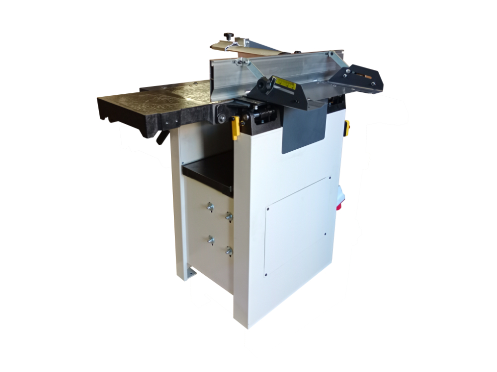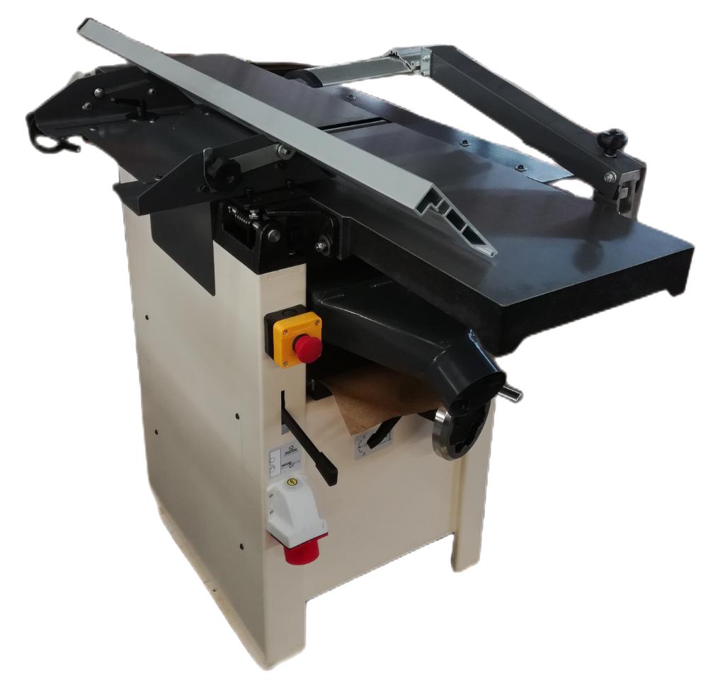 Верхний модуль может быть полностью поднят, не мешая работе и удалению стружки. Станок оснащен эксцентриковым механизмом для удобной регулировки положения подающего и отводящего столов. Стальной трехножевой строгальный вал входящий в базовую комплектацию прост в эксплуатации, надежен и не требует регулировки. Благодаря непрерывному входу ножа в заготовку, вал работает тихо и без вибрации. Скорость вращения 5500 об/мин обеспечивает чистоту реза. Для строгания вдоль кромки или под углом от 90 до 45 градусов станок оснащен параллельными упорами из жестких алюминиевых профилей.