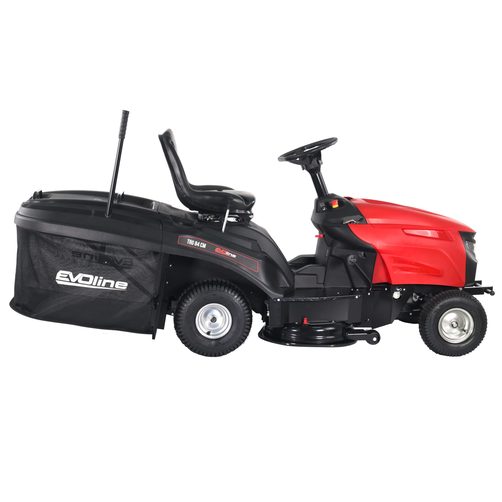 Мини-трактор EVOline TRG84CM может работать в двух режимах работы: сбор травы в травосборник и мульчирование. Включение вращения ножей происходит нажатием одной кнопки через электромагнитную муфту.