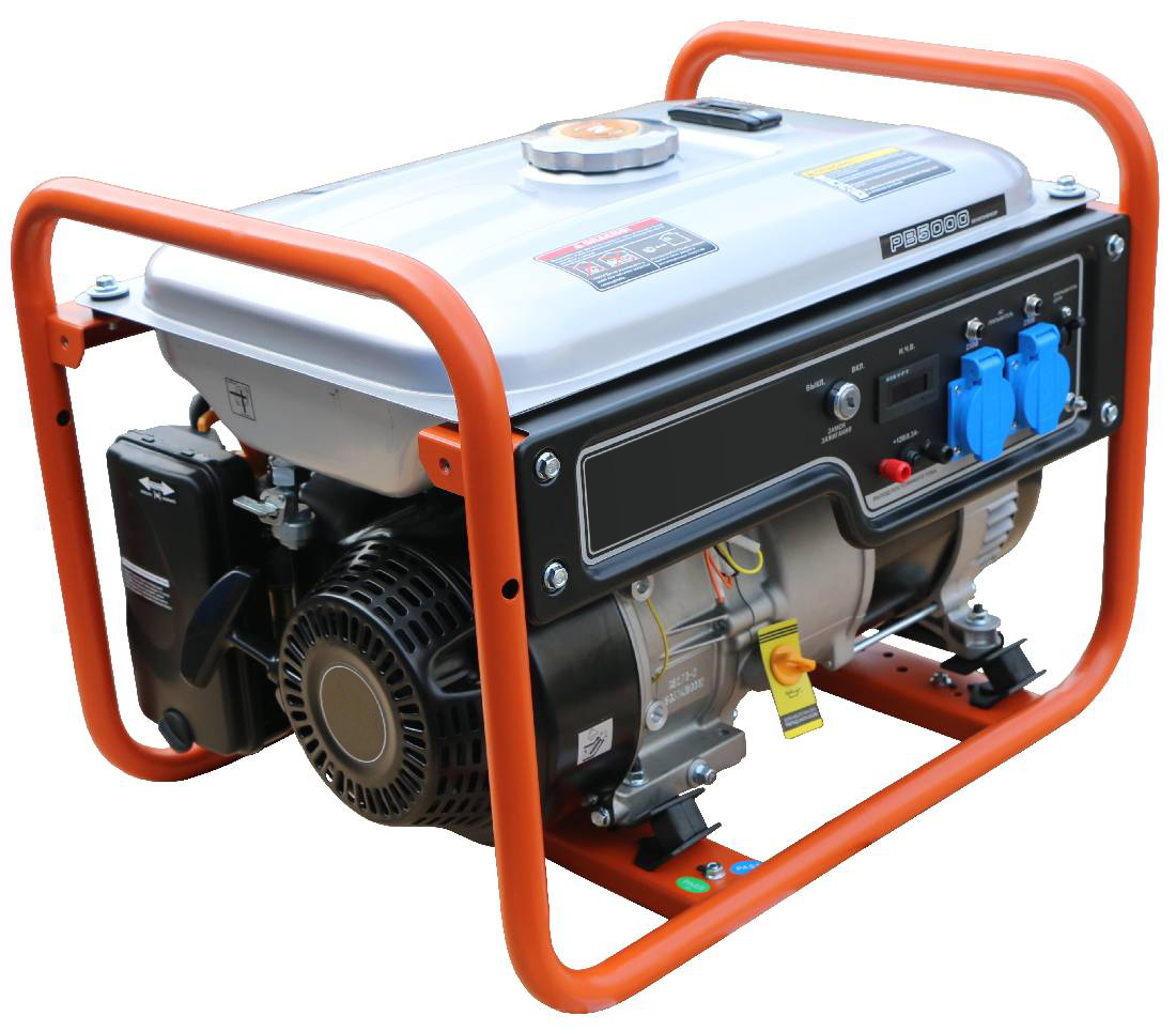 Однофазный бензиновый генератор EVOline PB 5000 открытого исполнения. Генератор оснащен топливным баком, объём 15 л. Силовым элементом генератора является двигатель GB 270 мощностью 9 л.с. Также генератор оборудован регулятором напряжения AVR, который обеспечивает стабильное выходное напряжение. На корпусе бензогенератора установлено две розетки для подключения потребителей.