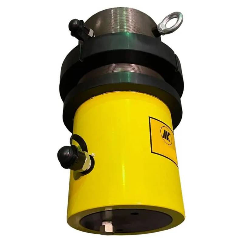 Универсальный домкрат с гидравлическим возвратом и установочными гайками Инстан ДУ70-200ГФ, грузоподъемность 70 т, ход штока 200 мм. Предназначен для подъема груза, для использования в качестве составной части прессового оборудования. В качестве привода используется ручной или электрический гидравлический насос двустороннего действия с рабочим давлением 700 бар. С торцевой стороны имеется отверстие c резьбой NPT 1/4" под установку манометра, для контроля давления в ГЦ.