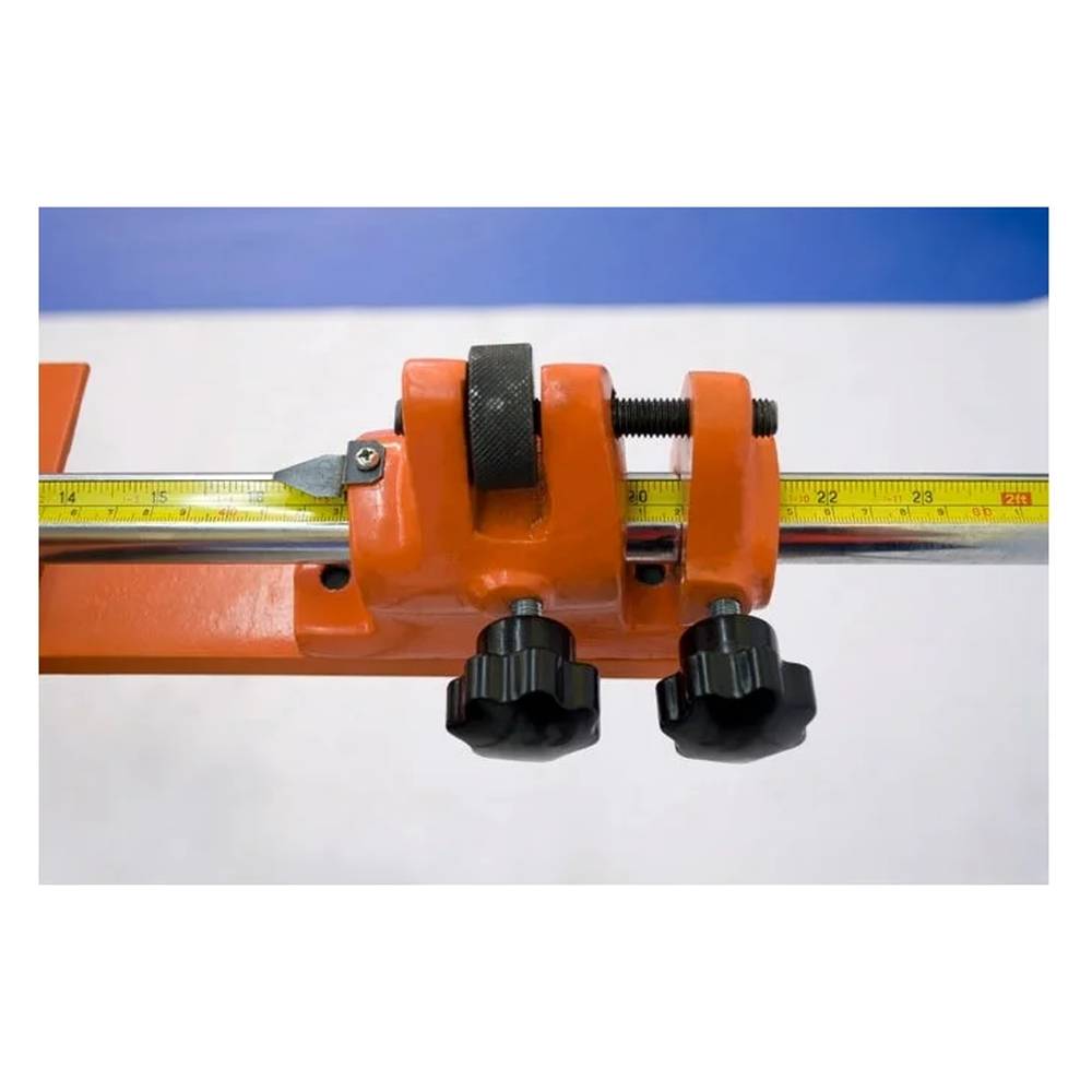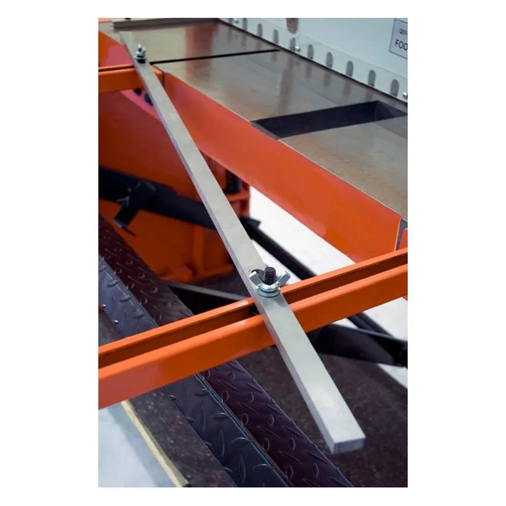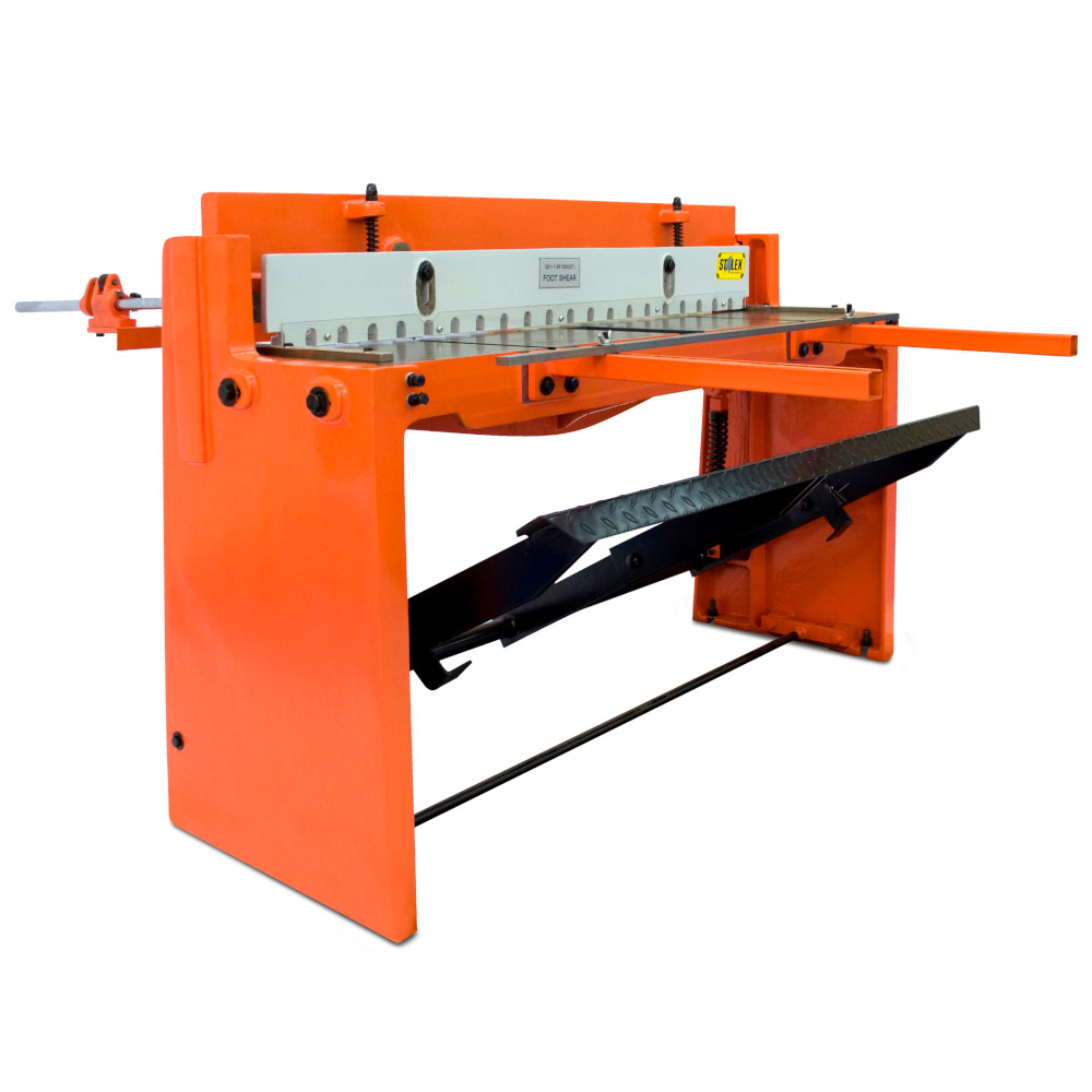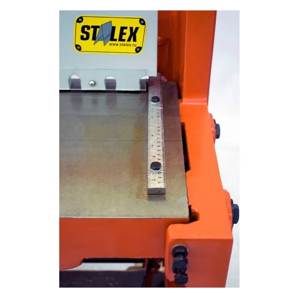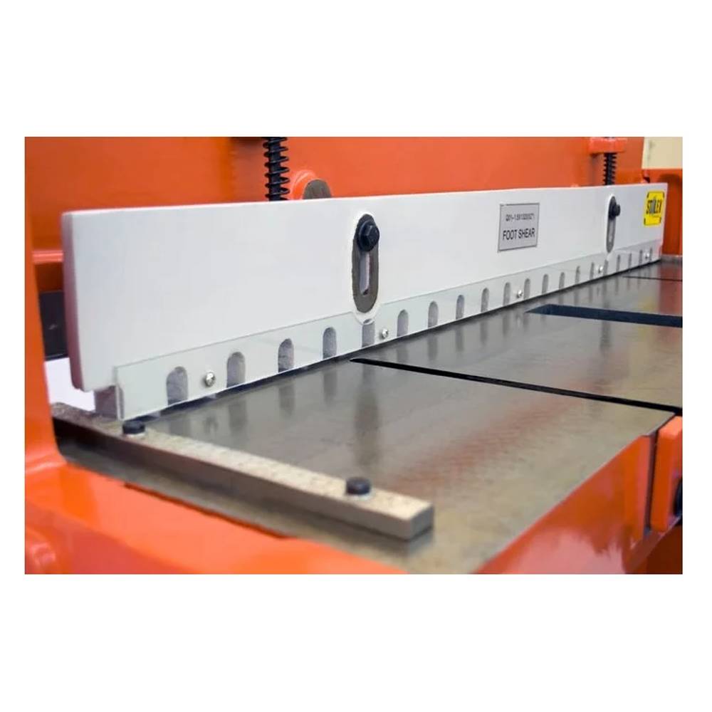 Модель оснащена резаками из высокоуглеродистой стали и механизмом надежного прижима листа. Гильотина имеет ограничитель глубины подачи заготовки и ножную педаль с простым регулятором положения.