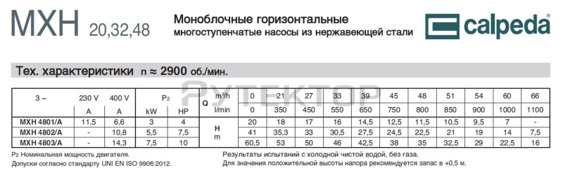Горизонтальный насосный агрегат Calpeda MXH 4802 - центробежный многоступенчатый. Выполнен в виде моноблочной конструкции. Корпус насоса и детали проточной части выполнены из нержавеющей стали.