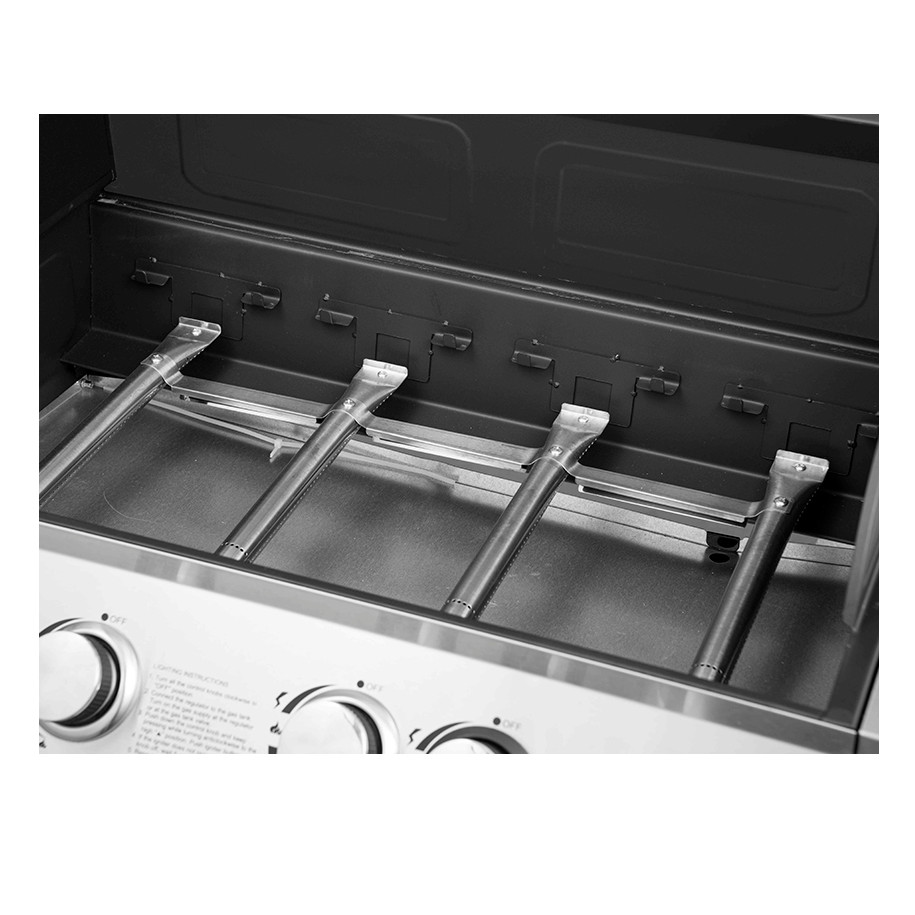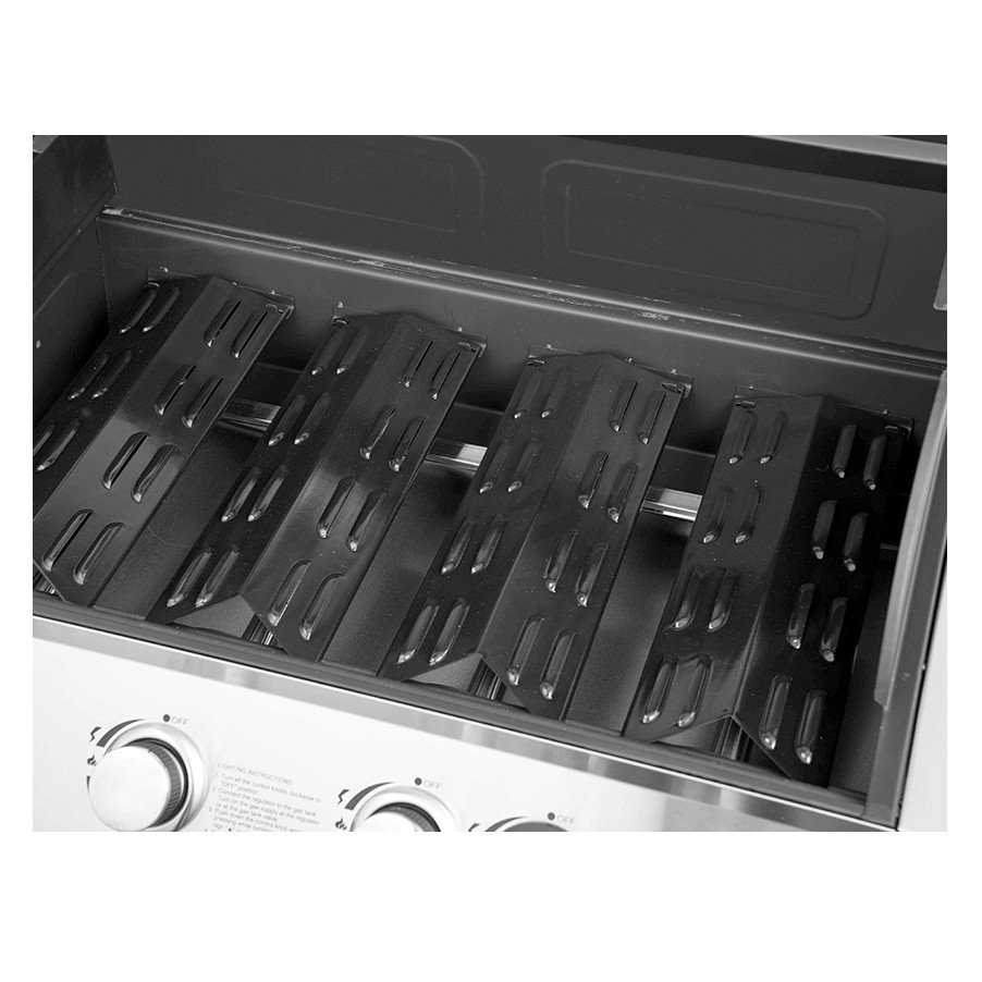 - Горелки с V-образными рассекателями пламени - рассекатели выполняют сразу 3 функции: обеспечивают равномерное нагревание, защищают горелки от попадания жира и маринада, испаряют сок, капающий с мяса, что придает блюдам вкус и аромат барбекю