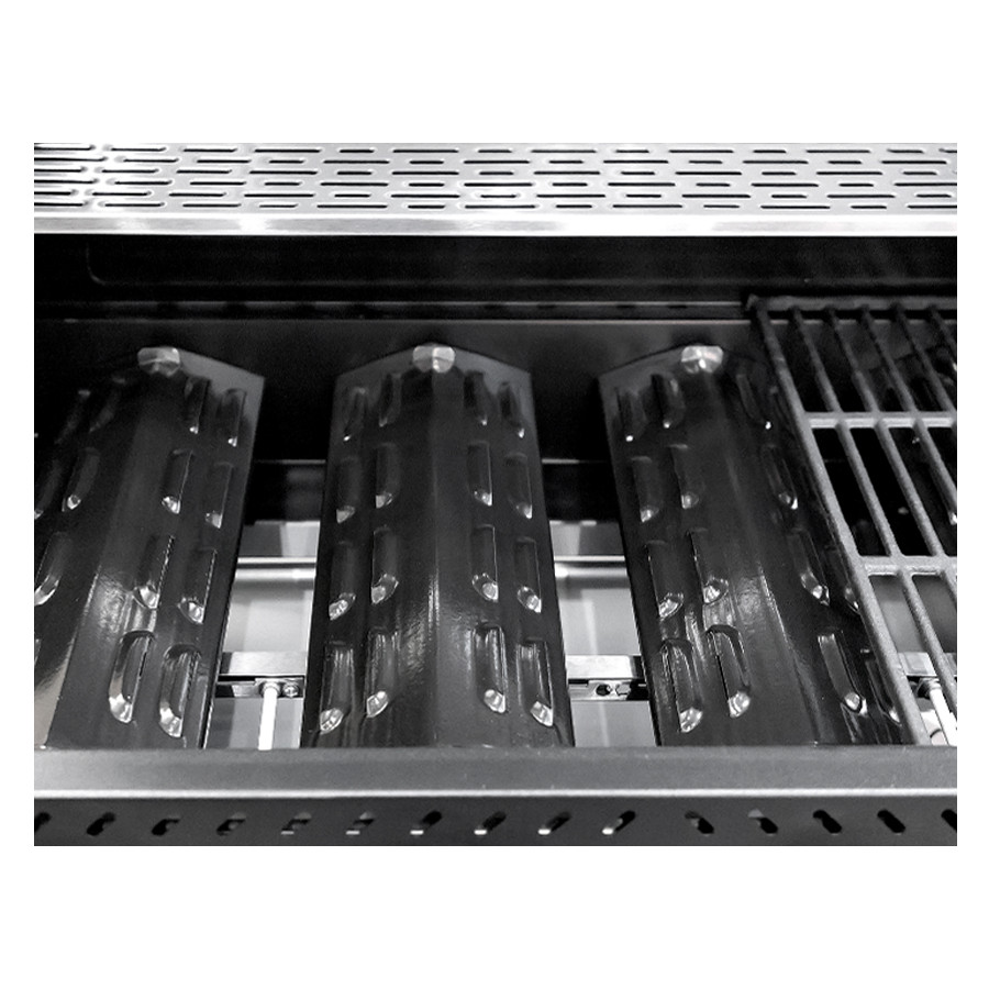 - Горелки с V-образными рассекателями пламени - рассекатели выполняют сразу 3 функции: обеспечивают равномерное нагревание, защищают горелки от попадания жира и маринада, испаряют сок, капающий с мяса, что придает блюдам вкус и аромат барбекю