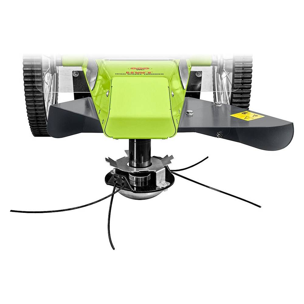 В стандартную комплектацию триммера входит стальная защитная пластина, предотвращающая разбрасывание скошенной травы; передний экран из прозрачного пластика, защищающий двигатель и не мешающий обзору оператора; нижняя пластина из резины, расположенная между колесами, предотвращающая выбрасывание скошенной травы в сторону оператора.