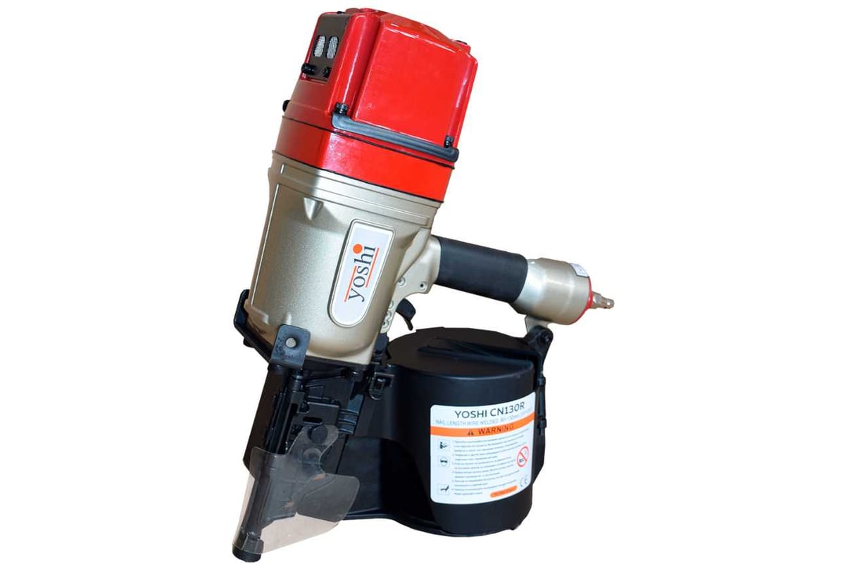 Пневматический гвоздезабивной пистолет Yoshi CN_130R— мощный инструмент для производства усиленных паллет, деревянных барабанов и каркасного домостроительства. Работает с барабанными гвоздями CNW диаметром 3,3–3,8 мм и длиной 90–130 мм. Поддерживает рабочее давление 6.5–8.5 бар, при этом расход воздуха составляет 3,2 Нл/выстрел. Вместительный магазин вмещает до 300 гвоздей, обеспечивая продолжительную работу без частой перезарядки. При весе 6 кг инструмент остаётся сбалансированным и удобным в эксплуатации.