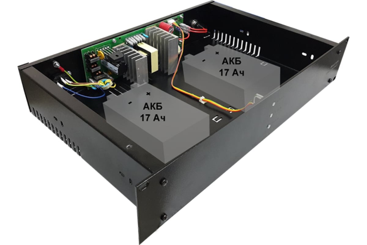Источник питания СКАТ-1200И7 RACK ИБП-12/5-2x17-RACK 12В, 5А, высота 2U под 2 2142 соответствует ФЗ 123 и ГОСТ Р 53325-2012. Защита выхода от перегрузки и короткого. Защита АКБ от глубокого разряда, короткого и переполюсовки. Контроль наличия АКБ. Холодный пуск. Корпус под шкаф 19", под 2 АКБ 7-17 Ач (внутренние), с возможностью подключения 2-х внешних АКБ до 40 Ач.
