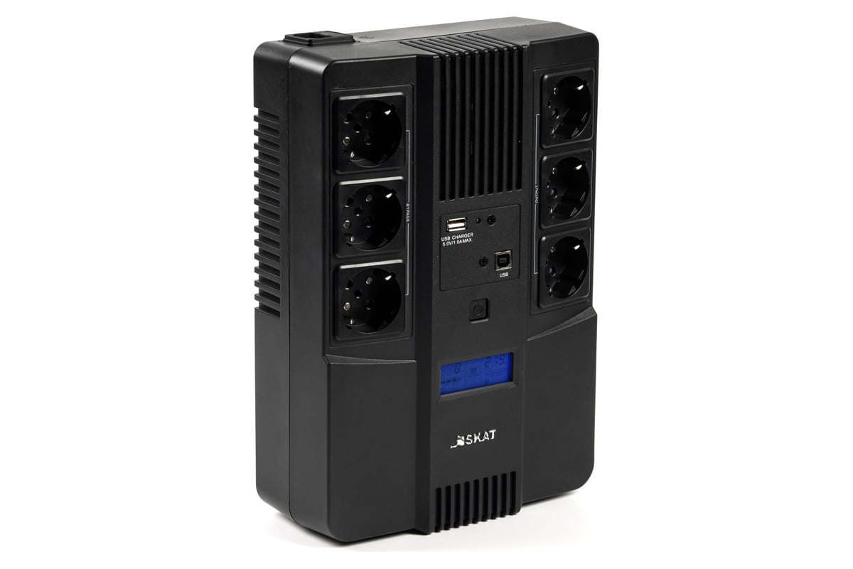 SKAT-UPS 800-AID-IN-1x9 - предназначен как для профессионального, так и для бытового назначения. Источник оснащен 6 розетками (с поддержкой и без поддержки резервной работы), LCD дисплеем, выходом USB для зарядки мобильных устройств и портами RJ-45 для защиты локальной сети - все что нужно для безопасной работы компьютерной техники.