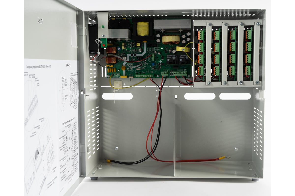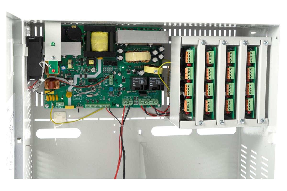 Источник питания SKAT-V.32 32 выхода 12-15В, 0,5А канал, корпус 2 АКБ 40Ач 840 с независимой регулировкой выходного напряжения по каналам. Фильтрация помех по каждому каналу. Защита от короткого замыкания и перегрузки по каждому каналу. Имеет 32 выхода по 0,5 А или 16 выходов по 1 А. Регулировка выходного напряжения, регулируемый ток заряда АКБ, максимальный ток по всем выходам - 14 А. Корпус под 2 АКБ 40 Ач. 5 информационных выходов о состоянии источника.